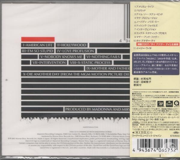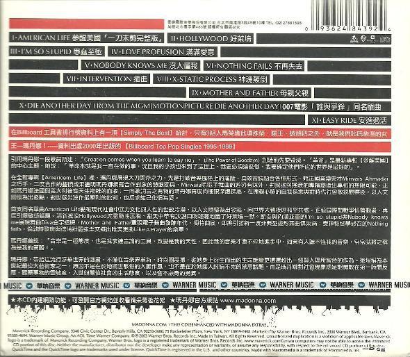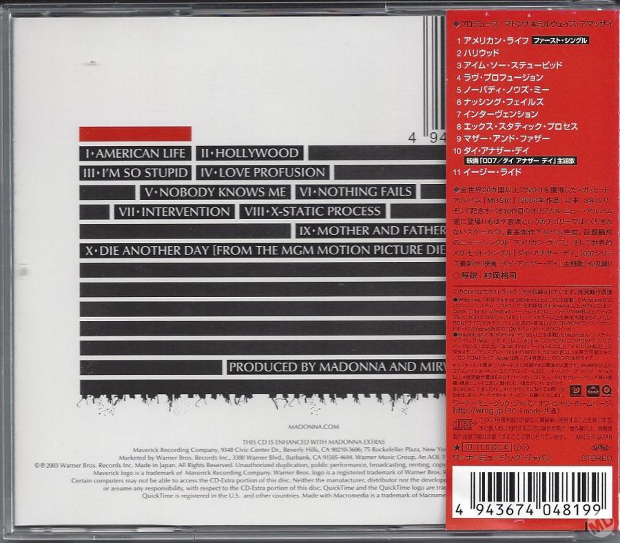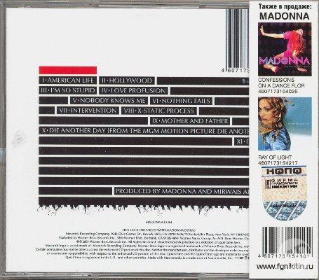 - El disco se componía de 11 tracks, uno de los cuales era la canción «Die Another Day», lanzado como single del soundtrack del film del mismo nombre en 2002. Además, se editaron 4 singles (3 de ellos con videoclip): «American Life», «Hollywood», «Nothing Fails» y «Love Profusion», el primero de ellos no logró buenas posiciones en los charts y los demás últimos ni siquiera pudieron ingresar en el Billboard HOT100, siendo la primera vez que Madonna no logra obtener un sencillo en el chart desde 1983.