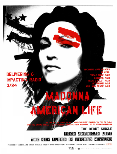 - «American Life» es el noveno estudio album de Madonna lanzado el 21 de Abril 2003 por Maverick Records y Warner Records. Fue también el último disco que Madonna realizó con la compañía Maverick luego de la finalización de su contrato de 11 años con la empresa.