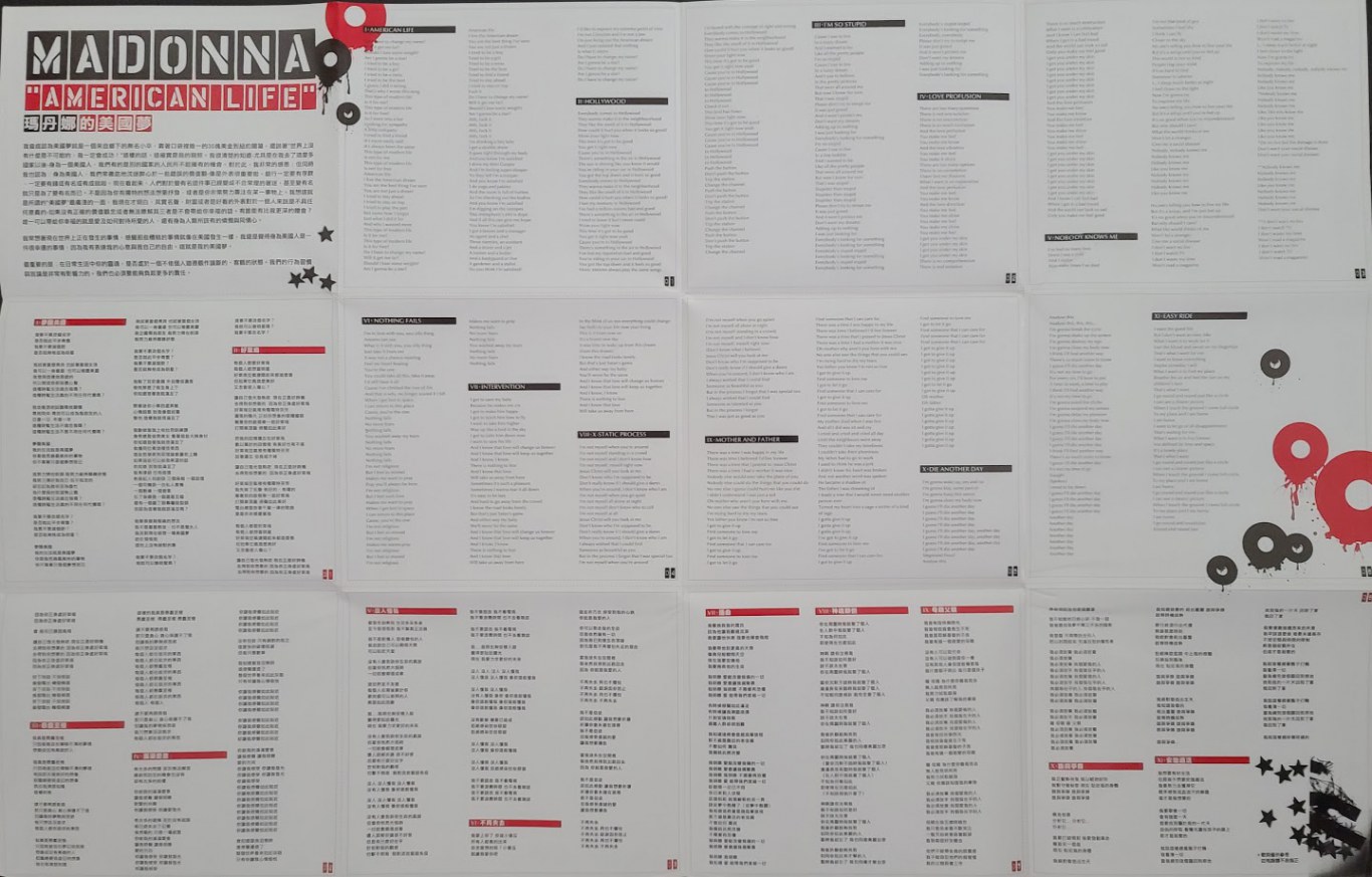 01 – «AMERICAN LIFE» (04:58): primera canción del disco y primer single lanzado el 24 de Marzo de 2003. Es también el primer single digital de Madonna disponible para descarga desde su sitio web. Con esta canción, Madonna hace una dura crítica a la sociedad americana y a sus valores distorcionados en favor de la superficialidad y el materialismo. Es también conocida por se una de las pocas veces en que Madonna rapea en una canción (a pesar de que muchos la mencionaron como un «rap de señora rica»), el segmento del rap es uno de los mejores momentos de la canción. El single fue uno de los más grandes fracasos de la carrera de Madonna quedando en el puesto N°37 del HOT100 con una permanencia total de 8 semanas. Su video clip generó gran polémica debido a su temática bélica en medio de todo el conflicto con Irak, Madonna decidió retirar su video y grabó otra versión insulsa en su lugar. Lee el artículo aquí.