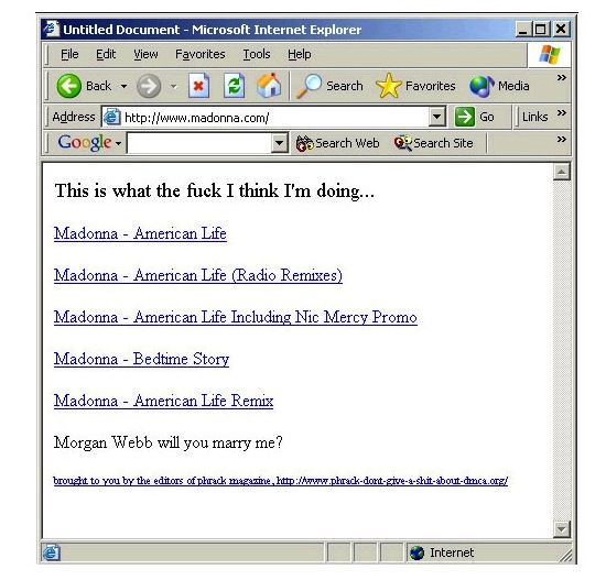 - Para contrarrestar las descargas ilegales del álbum, los asociados de Madonna crearon varios archivos MP3 falsos de tamaño y longitud similares. Algunos enviaron un breve mensaje de Madonna diciendo «¿Qué diablos crees que estás haciendo?» seguido de minutos de silencio. El sitio web de Madonna fue pirateado y el hacker agregó un mensaje que aparecía en la página principal, diciendo «Esto es lo que creo que estoy haciendo…» seguido de enlaces de descarga para cada una de las canciones del álbum. El sitio web estuvo cerrado después del ataque durante unas 15 horas. Liz Rosenberg negó más tarde las acusaciones de una movida de prensa para la salida del disco.