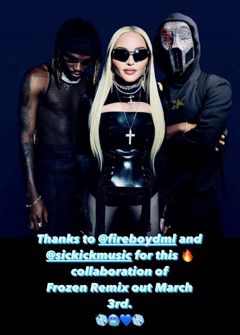 Luego de que la versión remix de «Frozen» (1998), a cargo del productor canadiense Sickick tuviera un éxito masivo en la plataforma Tiktok el año pasado, Madonna decidió sumarla a su colección de megahits y la lanzó como una colaboración el 05 de diciembre de 2021. Ahora, y mientras esperamos el lanzamiento del album de remixes, se realizó una nueva versión de «Frozen», esta vez a cargo de compositor y cantante nigeriano Fireboy DML.