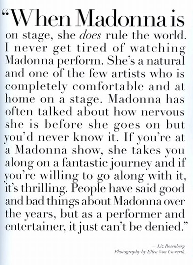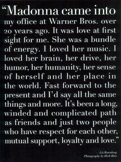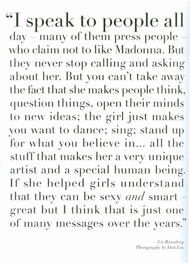 - Liz Rosenberg comentó: «hay muchos momentos inolvidables para mi. Uno de ellos es cuando bailamos al ritmo de ‘Deeper and Deeper’ en mi sala o cuando pasamos ‘Vogue’ en los clubes por primera vez. La lista sigue y estoy muy emocionada de haber vivido eso en primera fila».