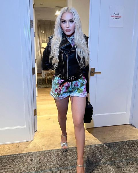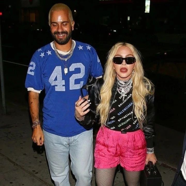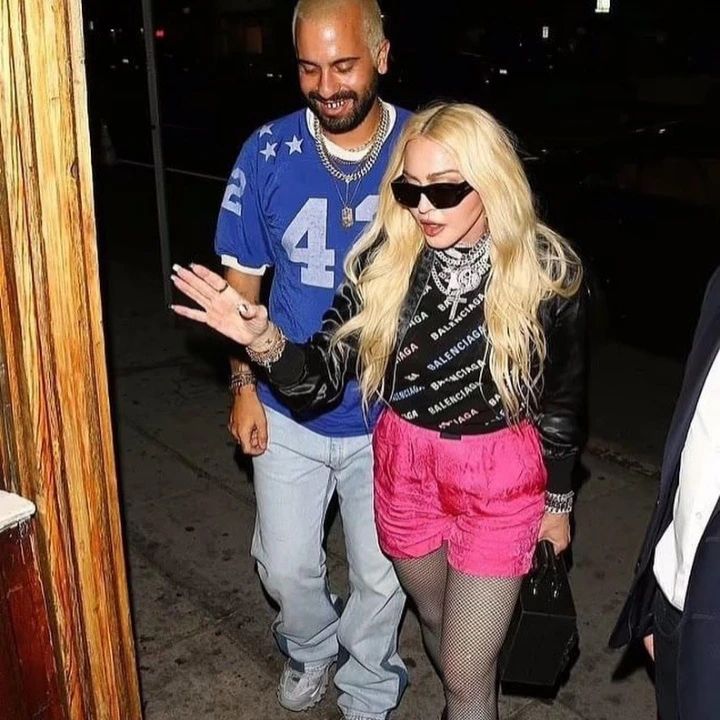 Luego de festejar la boda de Britney Spears, Madonna fue vista saliendo a cenar por Los Angeles junto a Ricardo Gomes. Luce un sweater Balenciaga y shorts rosa furioso.