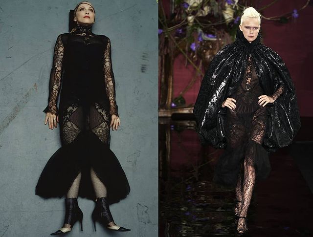 - Vestido largo de creppe con cuello alto, mangas y aplicaciones en falda de encaje en color negro de la colección otoño-invierno 2003 Haute Couture de Givenchy.