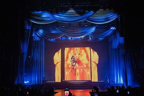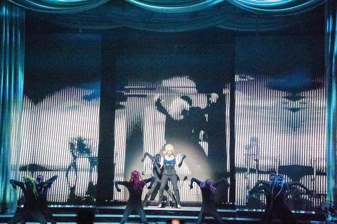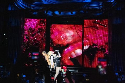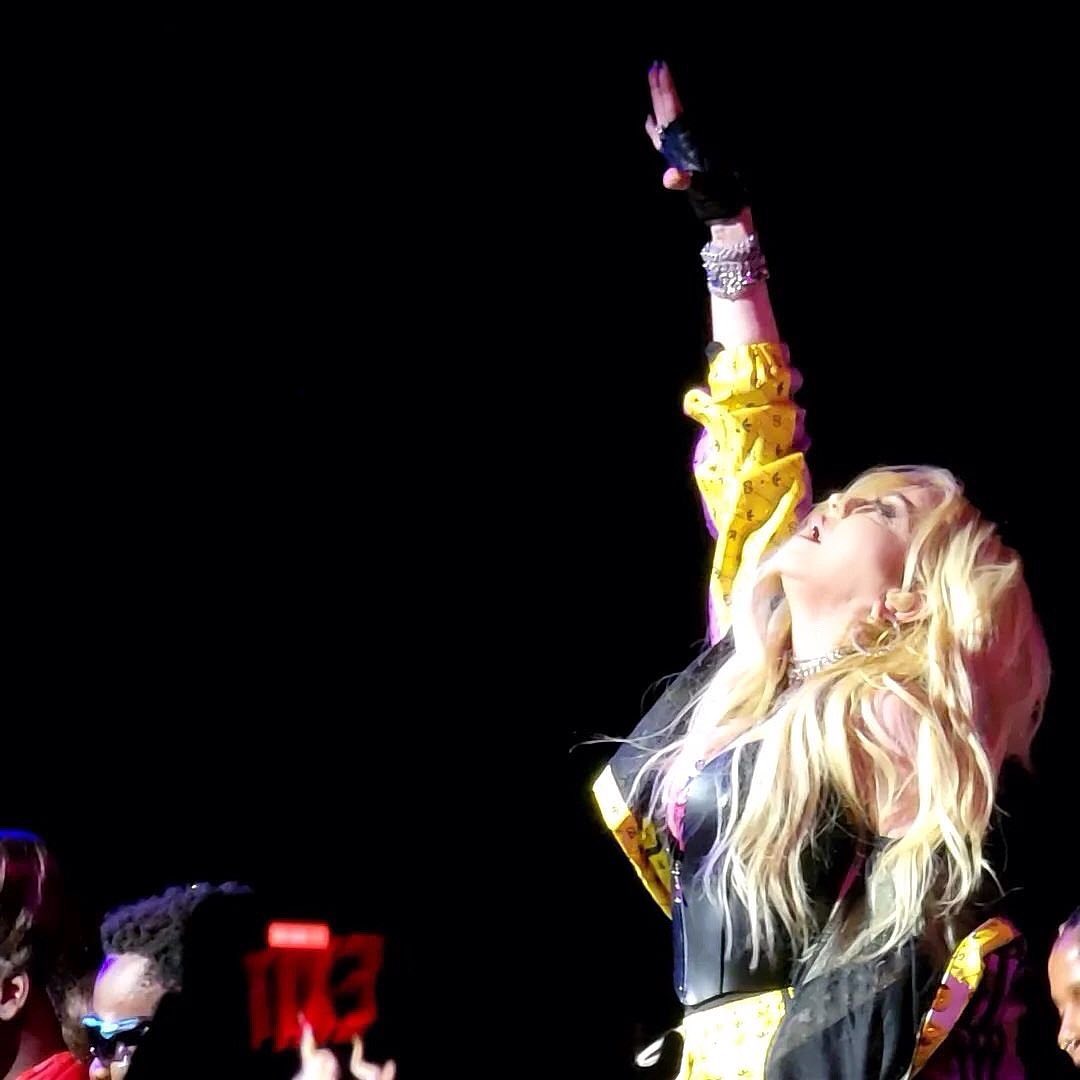 El tan esperado momento de la noche había llegado, apemas pasada la medianoche del 24 de Junio, «Terminal 5» se puso a vibrar el ritmo del «Gay Pride» y de Madonna. El show tuvo una duración aproximada de 30 minutos en donde pudimos ver actuaciones de las más famosas y reconocidas Drag Queens del programa «RuPaul’s Drag Race» rindiendo tributo a la Divina. Madonna por su parte, interpretó tres canciones: «Hung Up», «Material Girl» y «Celebration» (ninguna de las que pensábamos durante los ensayos… ya dijimos con Madonna nunca se sabe). La noche comienza con un videomix en las pantallas gigantes del escenario con varias escenas de diferentes videos de Madonna con la canción «Finally Enough Love». Luego hace su aparición Bob the Drag Queen, ganadora de la 8° temporada del «RuPaul Drag Race», quien realiza un monólogo de apertura e interpreta dos coreografías de las canciones «Bitch I’m Madonna» y «4 Minutes» con la participación como acompañante de David Banda. Le sigue Violet Chachki, ganadora de la 7° temporada del show de RuPaul quien realiza un tributo a «Justify My Love» con una impresionante coreografía con acrobacias con una silla colgada desde lo alto del escenario. Laganja Estranja (con ponytail incluída) y José Xtravaganza interpretaron «Vogue» al mejor estilo «Blond Ambition Tour».