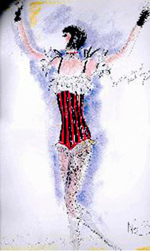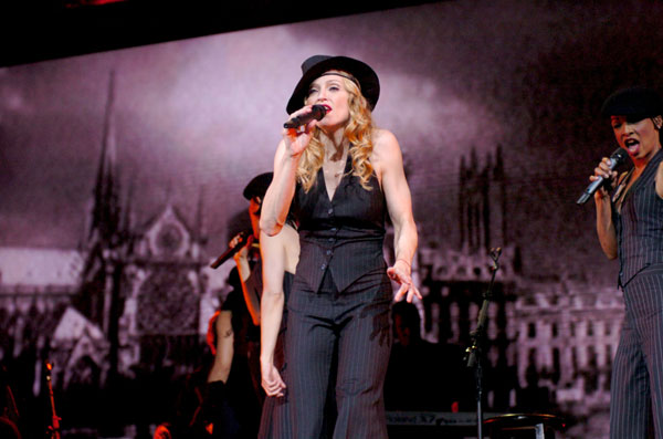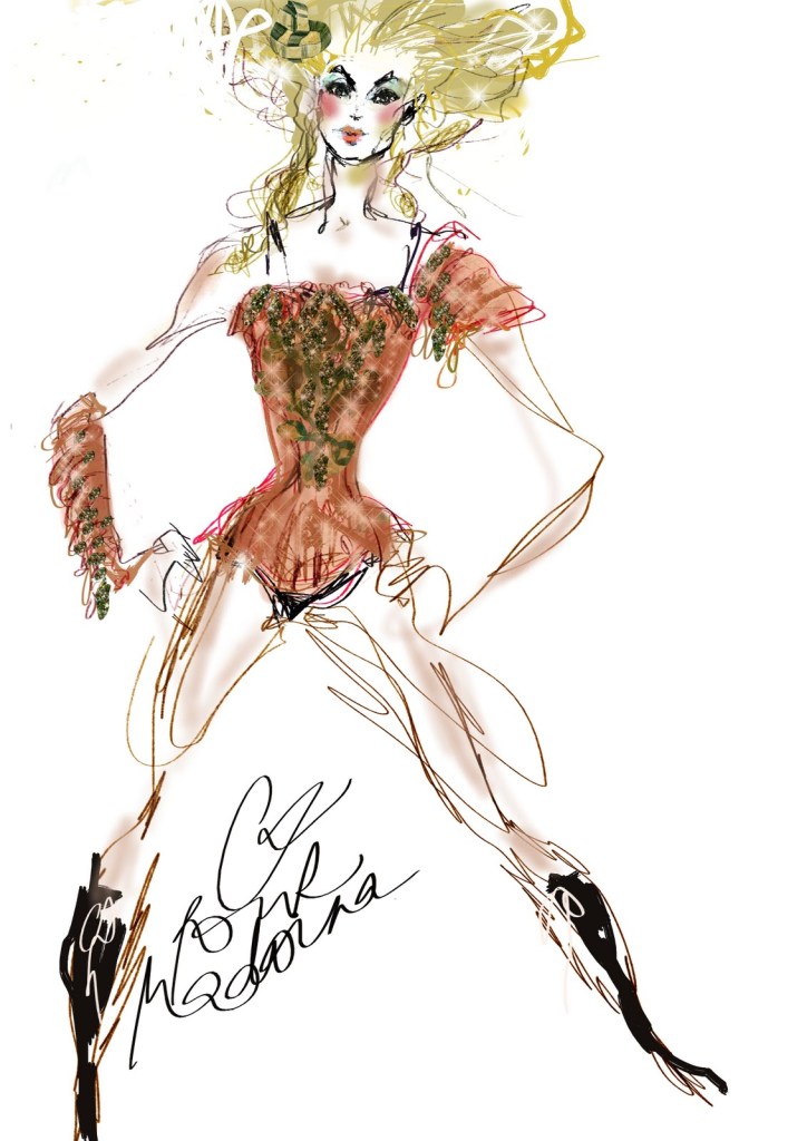 Para el segmento «Circo-Cabaret» se encomendó trabajo al diseñador Karl Lagerfeld de la firma Chanel. Este segmento estaba inspirado en las viejas películas de Fellini, en los circos, las ferias y las bailarinas de los años 20s. Madonna lució un corset con franjas rojo y blanco, aplicación de lentejuelas, cortas hombreras y un detalle de flecos en pedrería negra en el escote, hombres y mini faldón. Se completó el look con vincha negra con aplique de cristales, medias de red y zapatos de cuero rojo con tobillera de la firma Miu Miu. Lagerfeld, también realizó otra versión del cosert en blanco y negro, pero sólo fue usado para los ensayos generales ya que era muy similar a los corsets usados por las bailarinas.