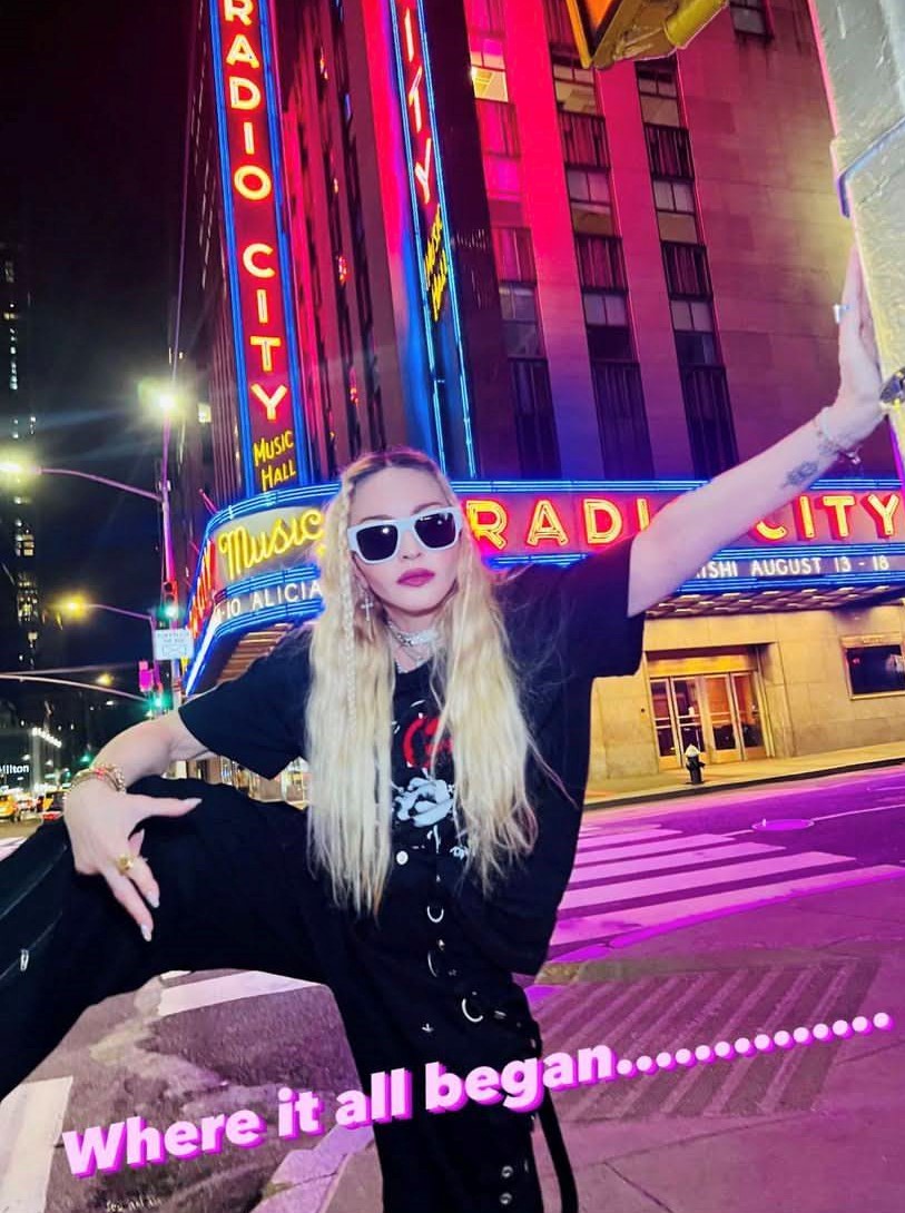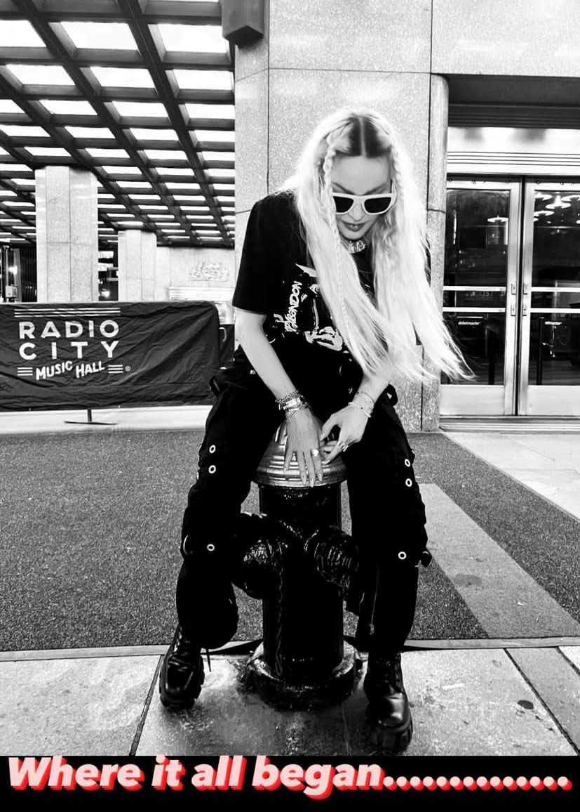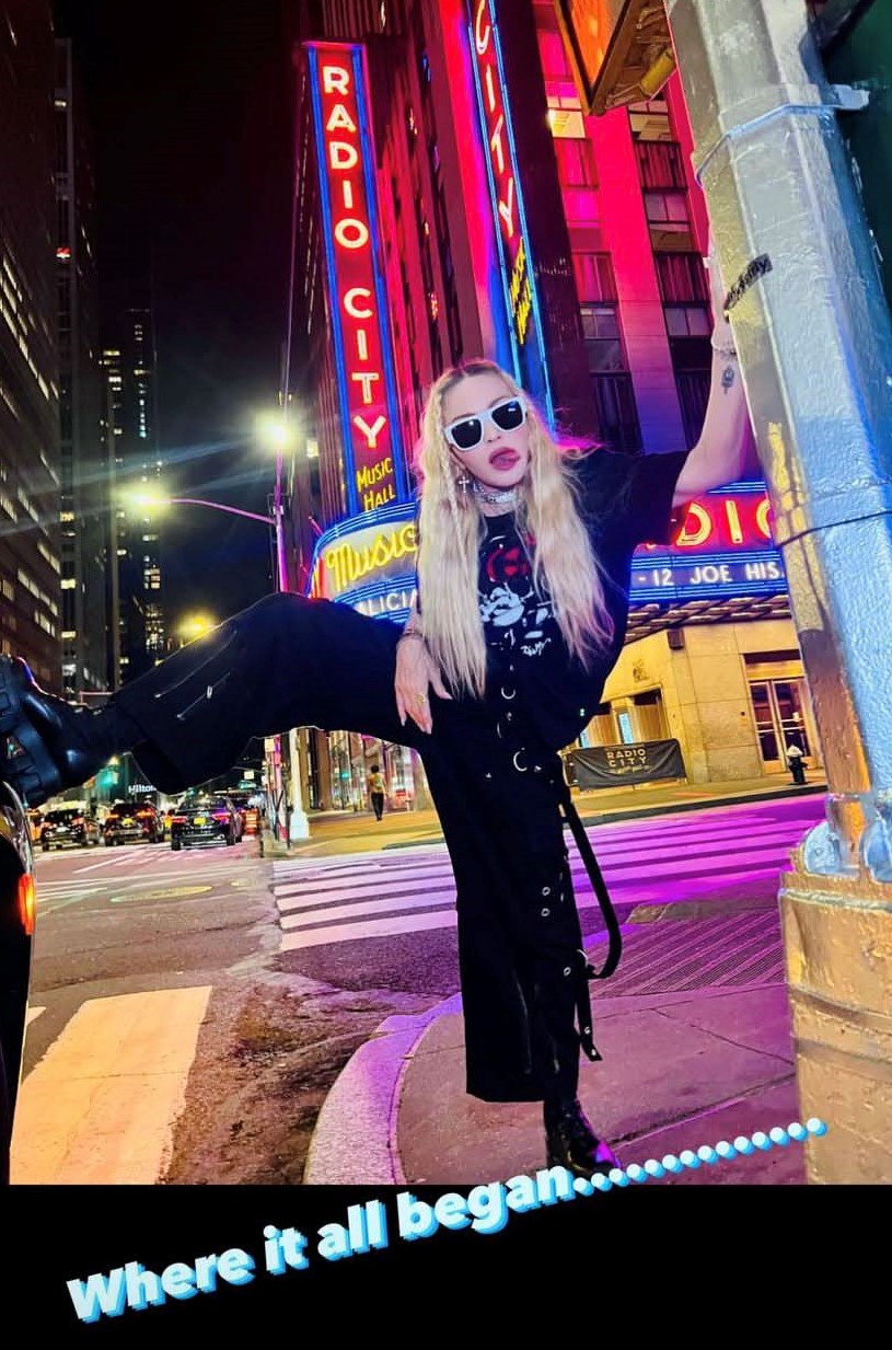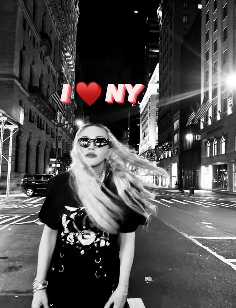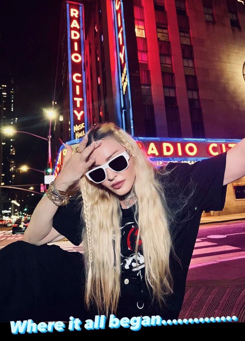 Madonna nos sorprendió a todos subiendo una gran cantidad de fotos a su cuenta de Instagram en donde la vemos posando muy alegremente en el corazón de Manhattan, ni más ni menos que en la puerta del «Radio City Music Hall». En un primer momento, la diva subió algunas fotos a sus Stories de Instagram en donde podíamos leer «Donde todo comenzó…» y «Amo NY», recordando aquellos años de juventud cuando llegó por primera vez a la gran ciudad. En las fotos, tomadas por Ricardo Gomes, la vemos con un look juvenil con pantalones anchos negros, camiseta y botas y con un detalle muy particular: una media con el rostro del rapero Tupac. Madonna posó en el portal de «Radio City Music Hall» como así también en medio de la quieta y solitaria calle de Manhattan. También subió un breve video en donde la vemos bajando de un coche con la música de fondo de su canción «I Love New York» acompañada del texto: «buscando locaciones» por lo que asumimos que la cantante estaría buscando lugares para el inicio de la filmación de su película autobiográfica.