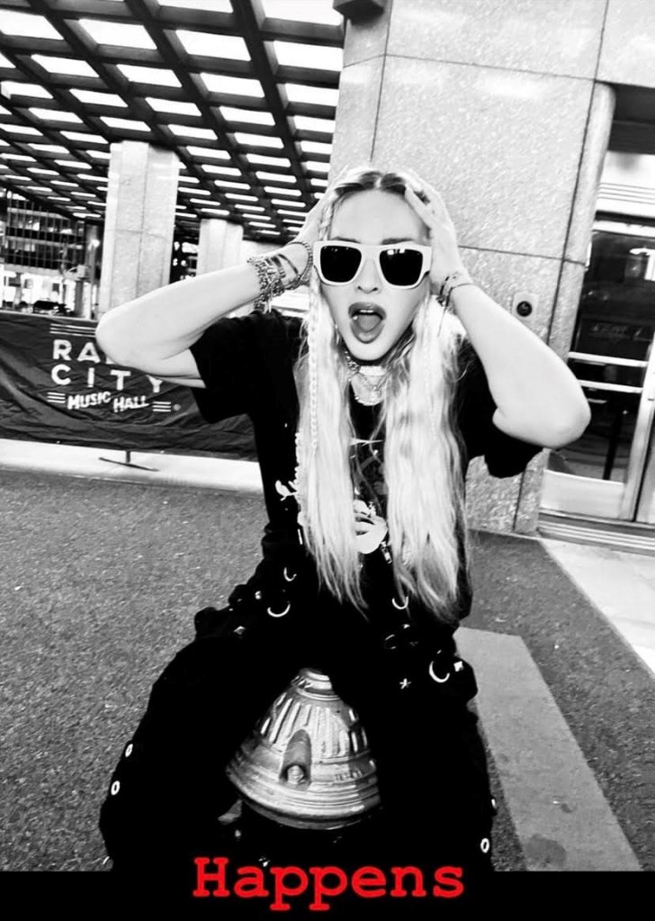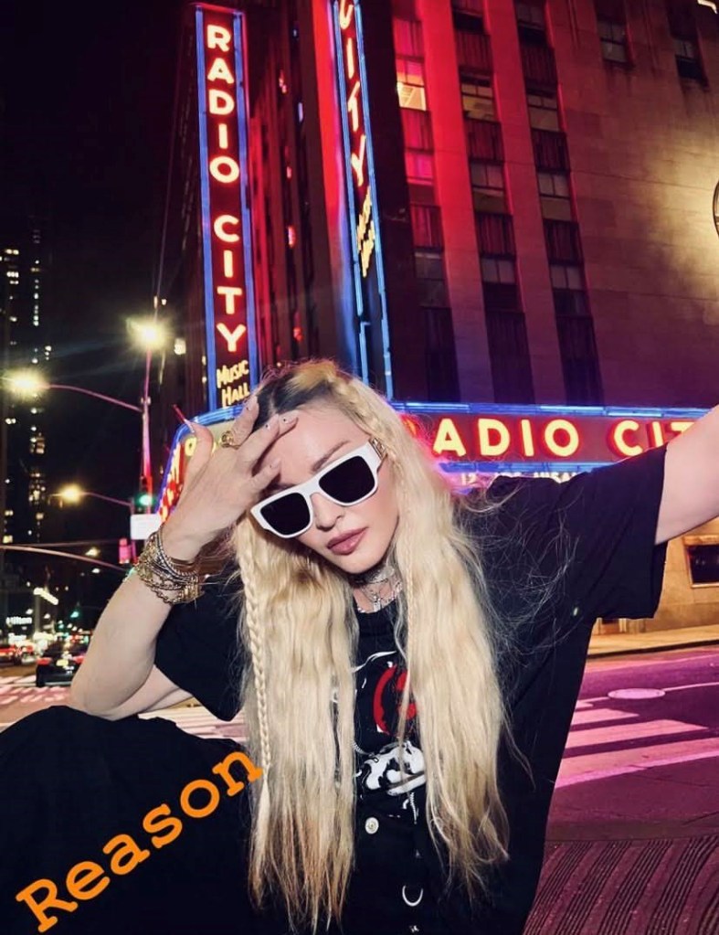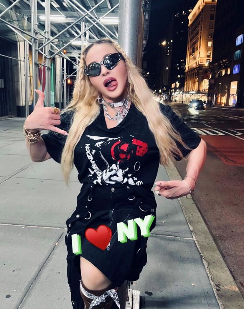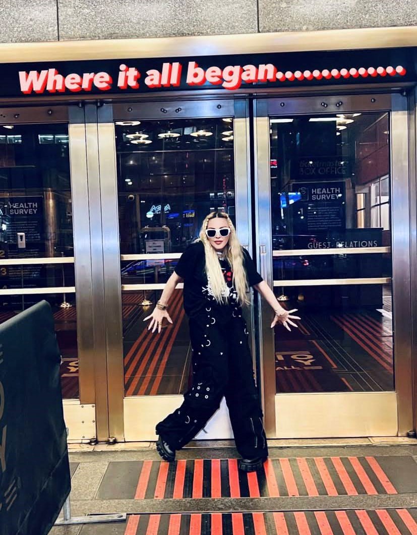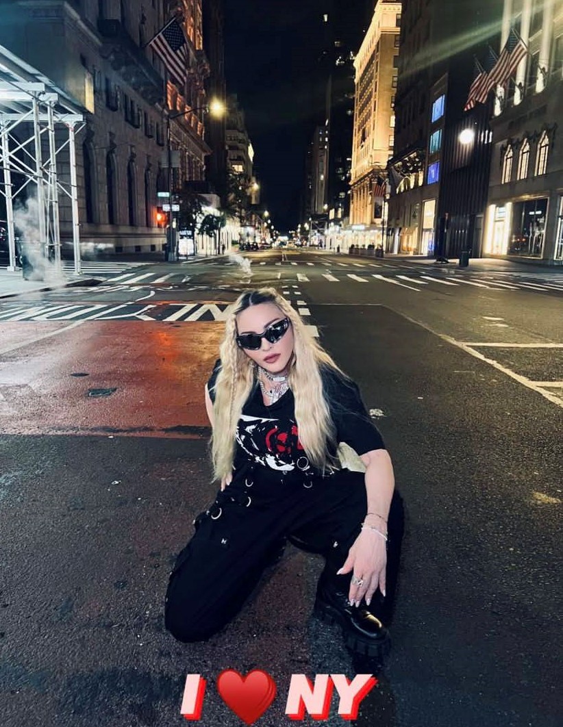 Madonna nos sorprendió a todos subiendo una gran cantidad de fotos a su cuenta de Instagram en donde la vemos posando muy alegremente en el corazón de Manhattan, ni más ni menos que en la puerta del «Radio City Music Hall». En un primer momento, la diva subió algunas fotos a sus Stories de Instagram en donde podíamos leer «Donde todo comenzó…» y «Amo NY», recordando aquellos años de juventud cuando llegó por primera vez a la gran ciudad. En las fotos, tomadas por Ricardo Gomes, la vemos con un look juvenil con pantalones anchos negros, camiseta y botas y con un detalle muy particular: una media con el rostro del rapero Tupac. Madonna posó en el portal de «Radio City Music Hall» como así también en medio de la quieta y solitaria calle de Manhattan. También subió un breve video en donde la vemos bajando de un coche con la música de fondo de su canción «I Love New York» acompañada del texto: «buscando locaciones» por lo que asumimos que la cantante estaría buscando lugares para el inicio de la filmación de su película autobiográfica.