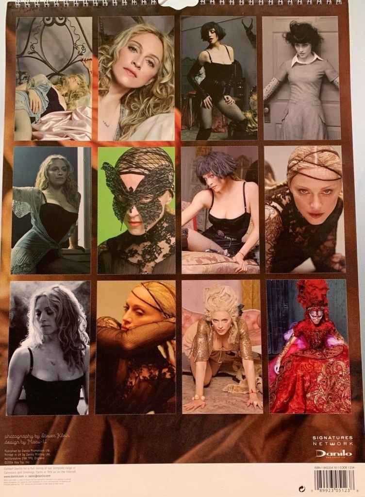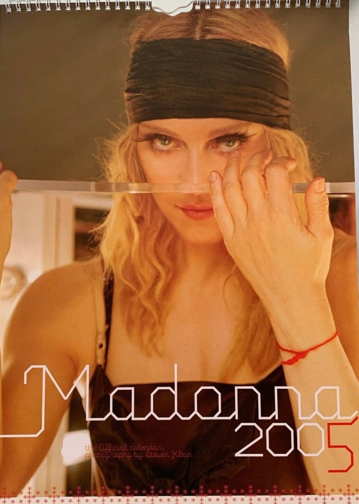 En el segmento memorabiblia de cada año, comenzamos como siempre con el calendario oficial 2005. Producido por la compañía Danilo, que se encarga de realizar los calendarios anuales oficiales de Madonna para Europa. El artículo consiste en un calendario en formato rectangular de los típicos con espiral en el borde superior, con gancho para colgar de 12″ x 16″ y un formato más pequeño cuadraro. Incluye una serie de fotografías tomadas por Steven Klein para su proyecto «X-tatic Process» cómo así también para la promoción de la gira «The Re-Invention Tour» del 2004.