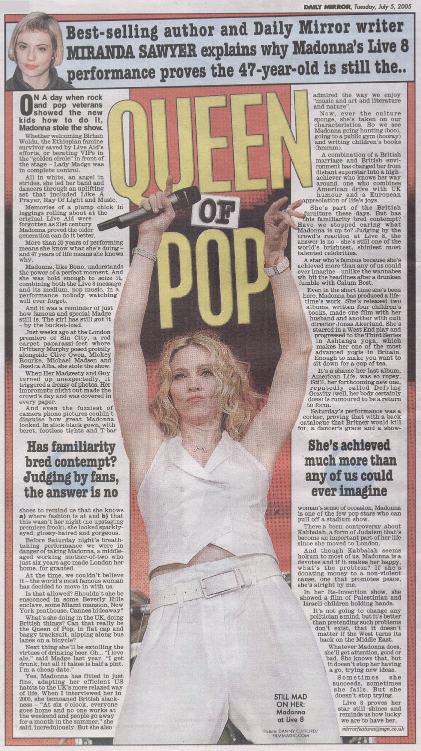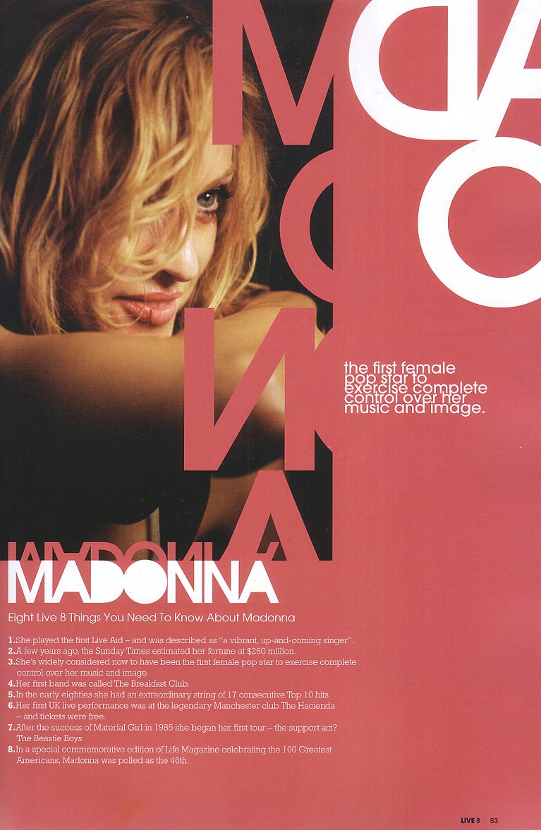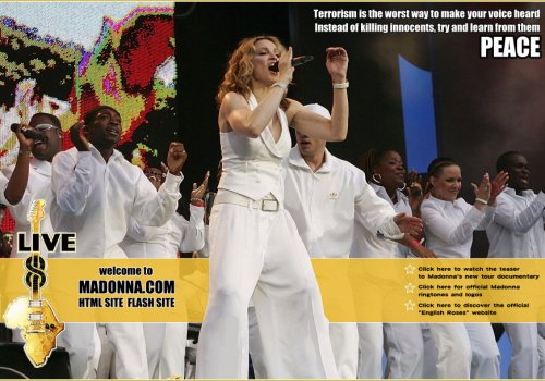 Más de 1.000 músicos actuaron en los conciertos, que fueron transmitidos por 182 cadenas de televisión y 2.000 cadenas de radio teniendo una audiencia total de casi 2 billones de personas. Muchos actos del «Live Aid» original se unieron esta vez nuevamente. El 02 de Junio, Bob Geldof anunció oficialmente que Madonna formaría parte del concierto realizado en el «Hyde Park» de Londres ante una multitud de más de 200.000 personas. Madonna fue uno de los ocho actos en la capital inglesa y la única artista femenina que ha sido artista principal tanto en «Live Aid» de 1985 como en «Live 8» de 2005. Otros artistas que regresaron fueron U2, Paul McCartney, Elton John, Sting, The Who, George Michael, y organizador, Bob Geldof. Fue necesario un poco de esfuerzo por parte de Geldof para ganar el compromiso de Madonna la segunda vez, como explicó Madonna a John Norris de MTV en una entrevista entre bastidores después de su actuación: «Bob Geldof me envió una carta preguntándome ‘¿harás Live 8?’ y realmente no me dijo nada y dije ‘¡Oh, amigo común, tienes que hacerlo mejor que eso! Demuéstrame que va a marcar la diferencia y estaré ahí para ti’. ¡Y lo hizo!”.