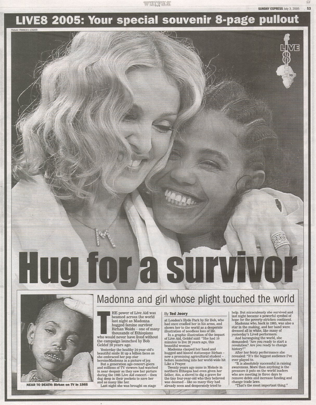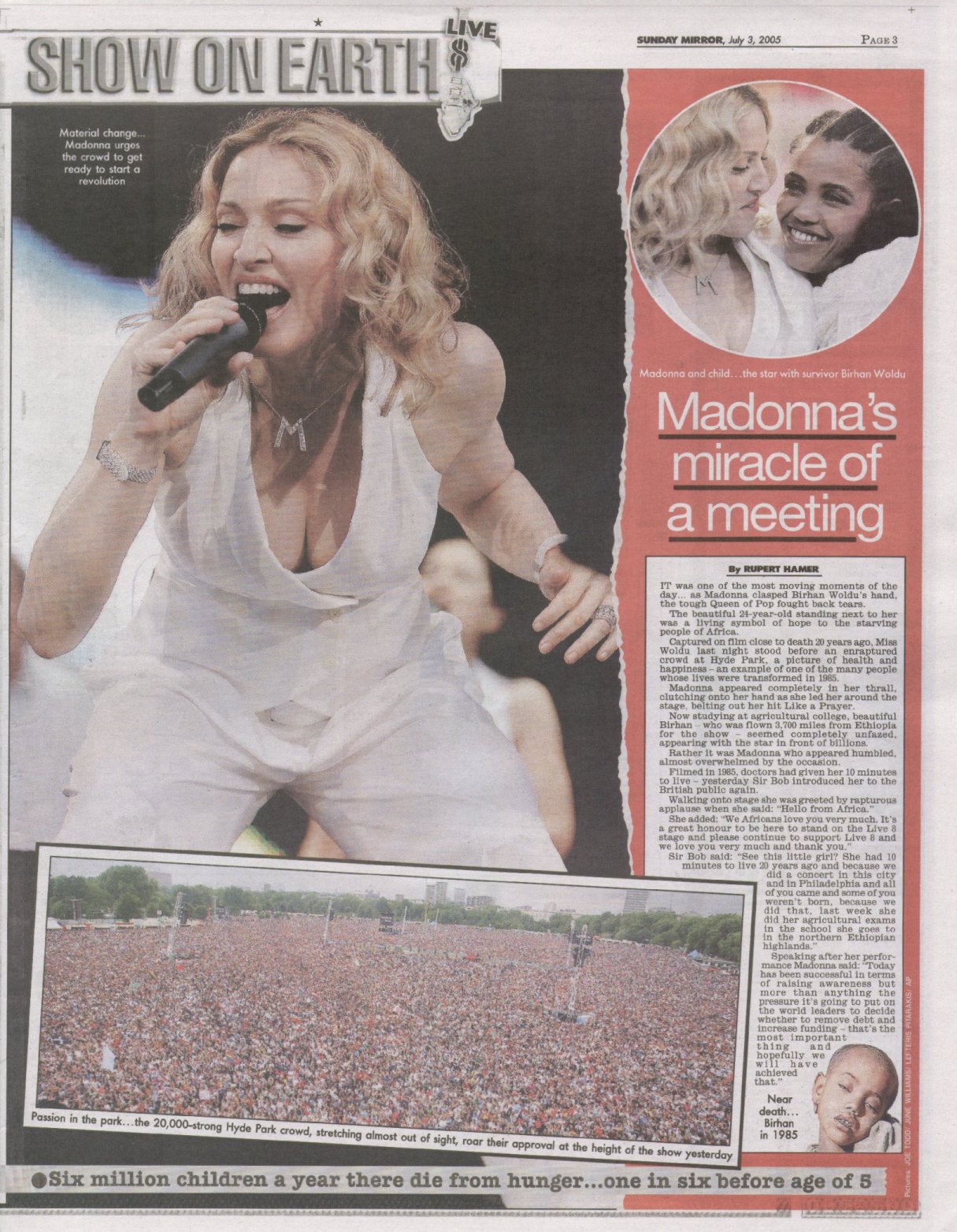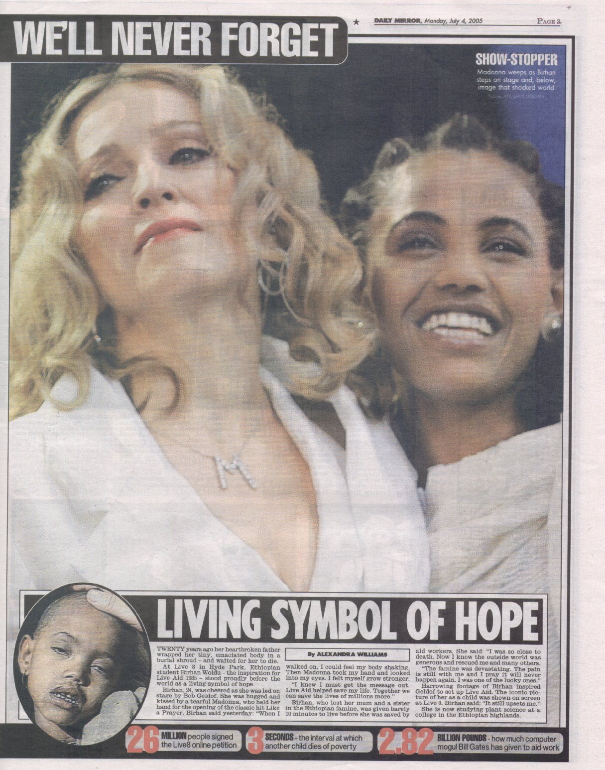 Para la presentación Bob Geldof subió al escenario a Birhan Woldu. En 1985, ella era la famosa niña hambrienta de un informe de CBC News que llevó a Geldof a organizar el «Live Aid» original. Cuando Geldof le preguntó a Woldu con qué artista quería aparecer, eligió a Madonna porque era el único artista del que había oído hablar. Madonna abrazó a Woldu en el escenario, sosteniendo su mano mientras interpretaba «Like A Prayer», en lo que resultó ser uno de los momentos más conmovedores del evento. En una entrevista posterior, Woldu recordó la experiencia: «la multitud parecía extenderse por millas, pero me había dicho a mí misma que no debía estar nerviosa. Solo había una imagen enorme de mí cuando era niña en la pantalla. Esa foto todavía me molesta. Fue tomada hace 20 años, cuando murieron mi madre y mi hermana. Sabía que debía ser fuerte por ellos, pero cuando seguí caminando pude sentir que mi cuerpo temblaba. Entonces Madonna tomó mi mano y me miró a los ojos, la multitud rugió y me di cuenta de que el mundo quería ayudar a mi continente. Me sentí crecer más fuerte”.