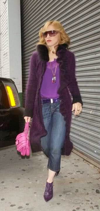 - Tapado de piel y cuello desmontable en color violeta de Roberto Cavalli (Madonna lo volvería a usar en reiteiradas oportunidades).