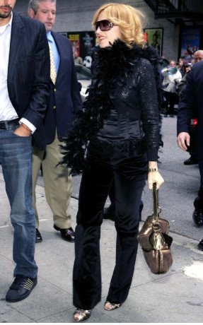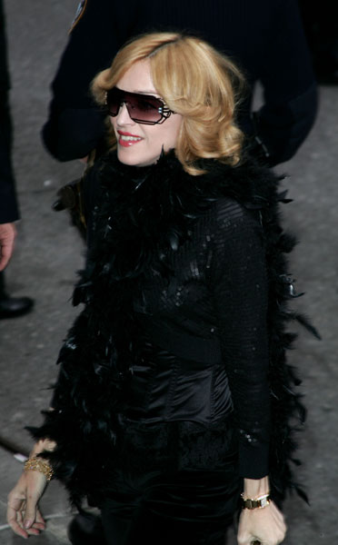 - Para la llegada al estudio, Madonna lució un pantalón de terciopelo negro con una chaqueta de lentejuelas negras y una boa de plumas del mismo color.