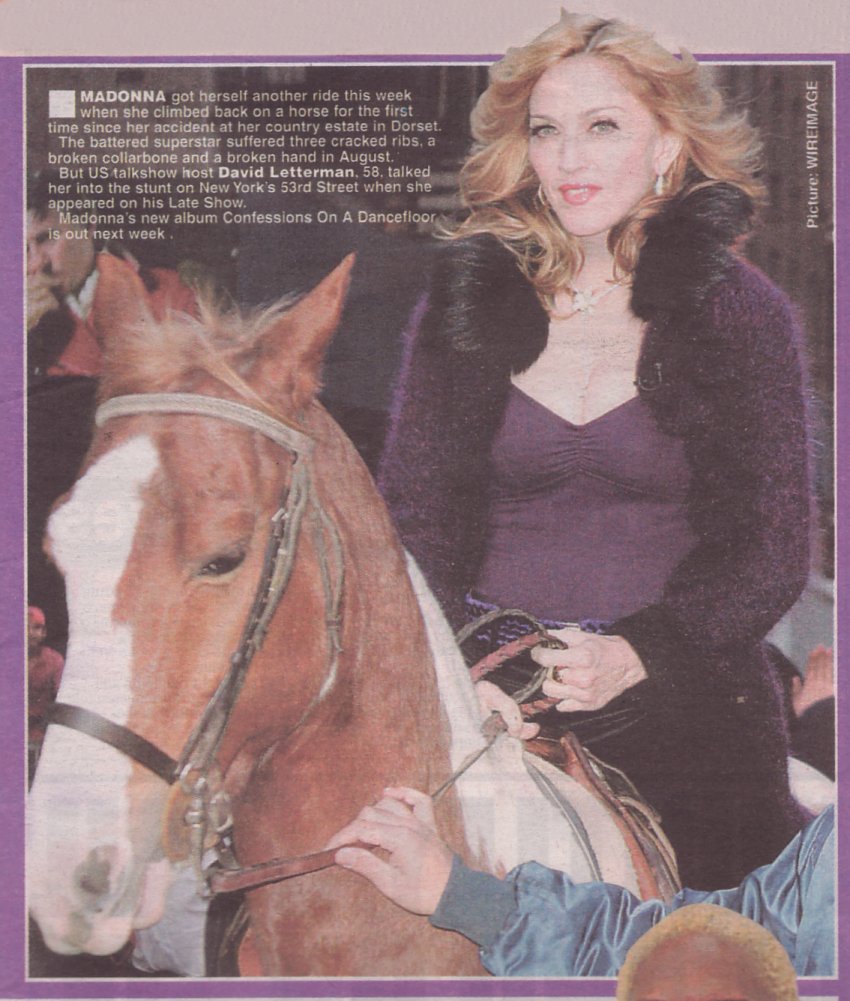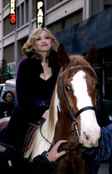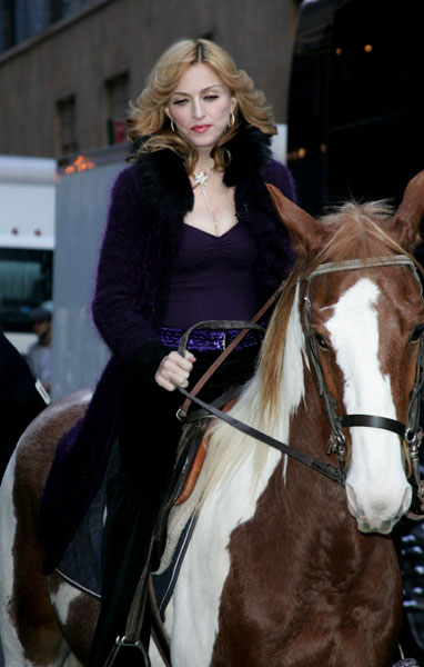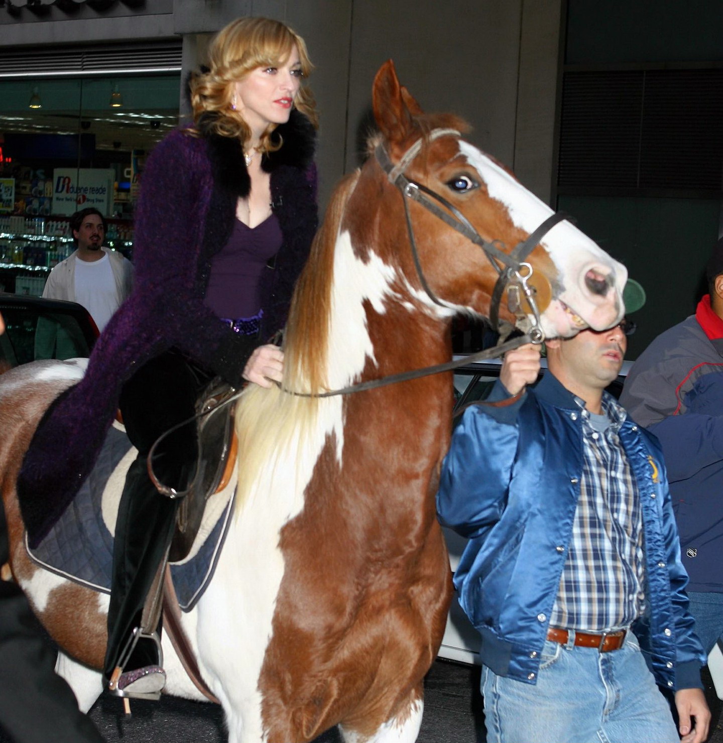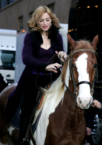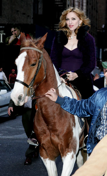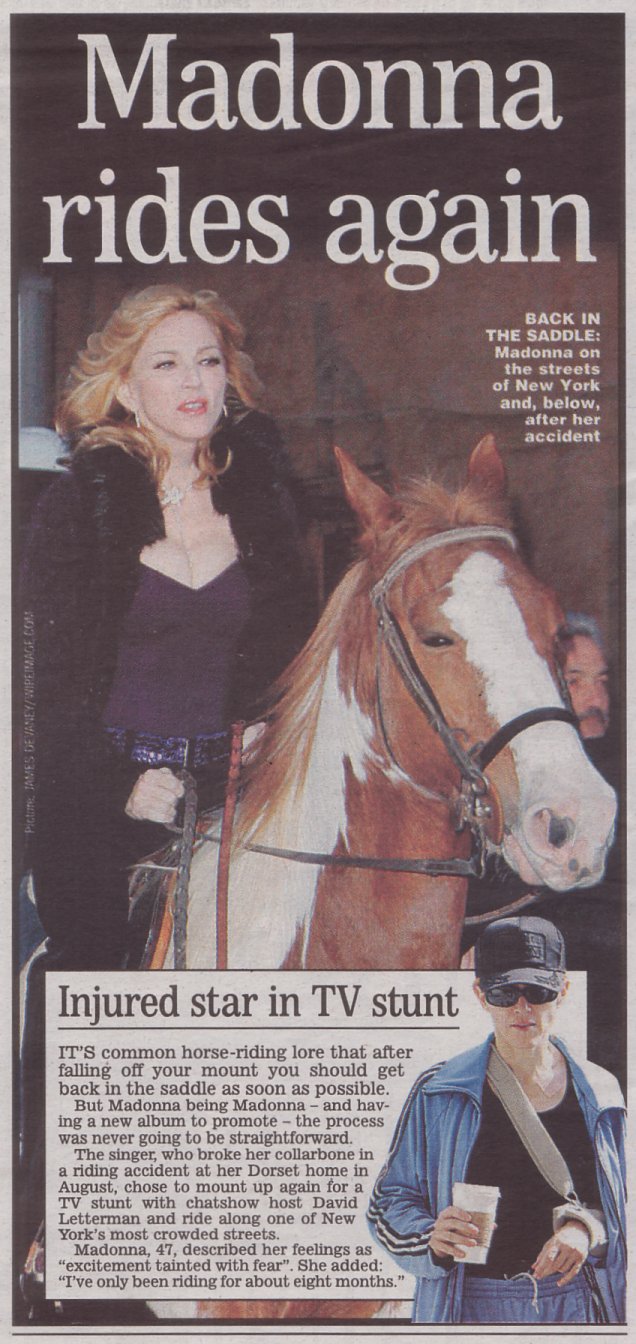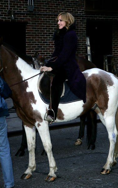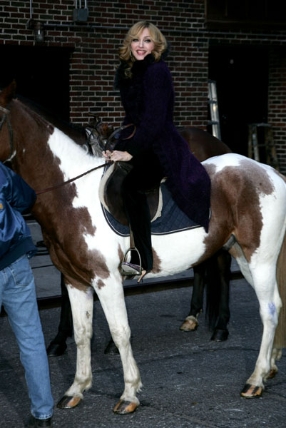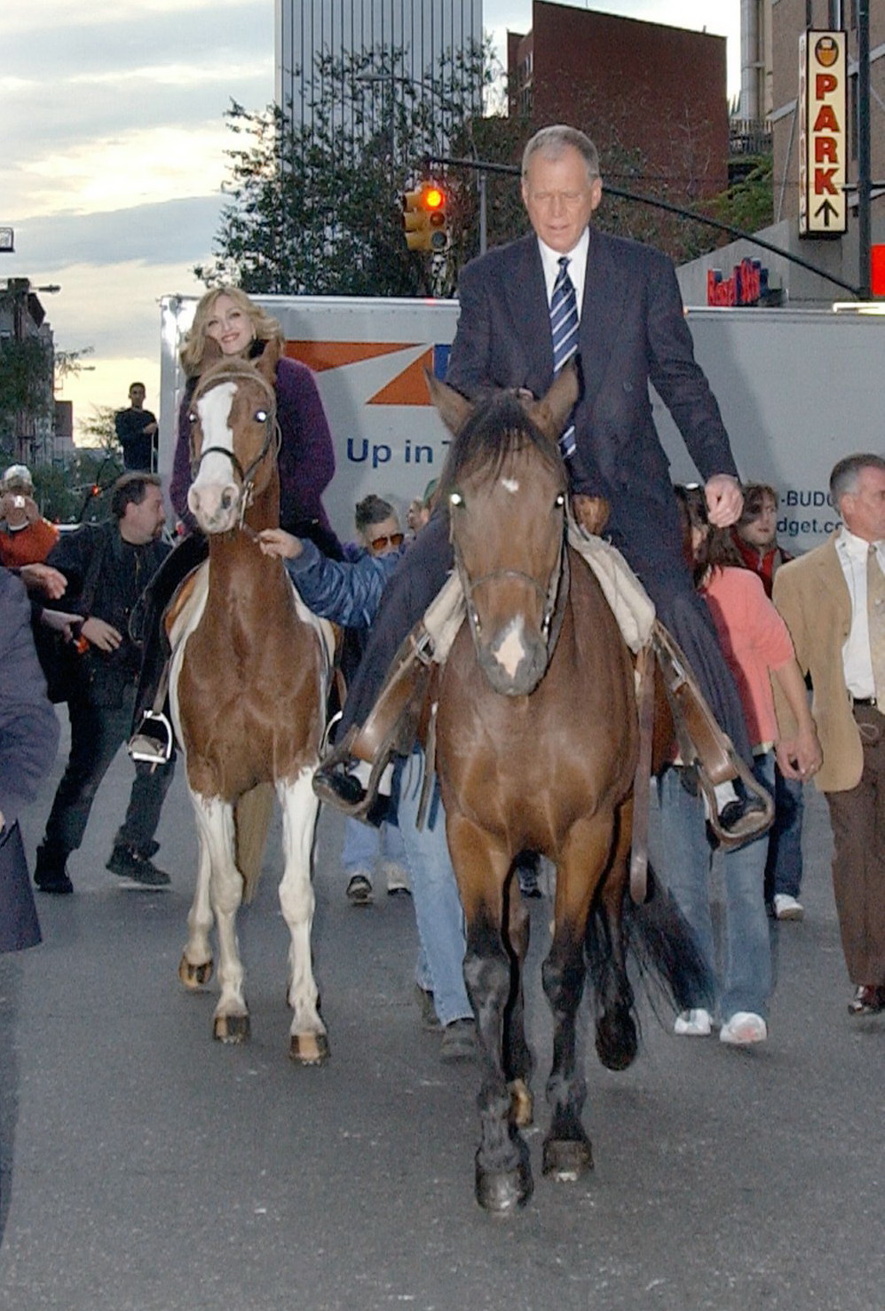 Uno de los momentos más sorpresivos del programa fue cuando vimos a Madonna y Letterman salir del estudio para montarse en sendos caballos y recorrer por más de una calle sobre la calle 53 junto al estudio de grabación. Esta era la primera vez que Madonna se subía a un caballo luego de su accidente. A pesar de todo, se la vio muy confiada y segura bromeando acerca de lo molesta que estaría su disquera al ver que pudiera hacerse daño nuevamente. Antes de realizar el paseo la diva comentó al conductor que no quería el caballo pequeño, «quiero el caballo grande, el más bonito… en fin… quiero el mejor caballo» dijo segura.