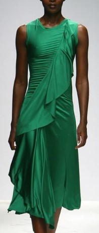 Para esta entrevista, Madonna usó un vestido de seda con vuelo cruzado en color azul eléctrico de la colección primavera-verano 2004 de Michelle Mason y lo acompañó con un colgante de diamantes circular y zapatos de cristales multicolor de Gina Shoes.