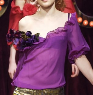 - Blusa de chiffón en color violeta con detalles de volados en escote y mangas abullonadas de «Dolce & Gabbana». Madonna usó esta prenda para las fotos del arte del disco y en algunas entrevistas.
