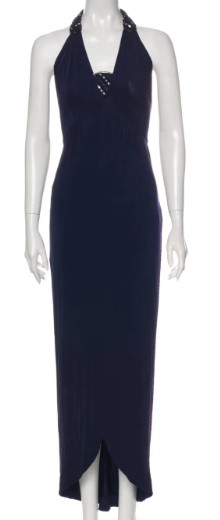- Vestido largo sin mangas con cuello atado en la nuca, detalle en plata y escote en «V» de cuero azul de la colección otoño-invierno 2005 de «Fendi».