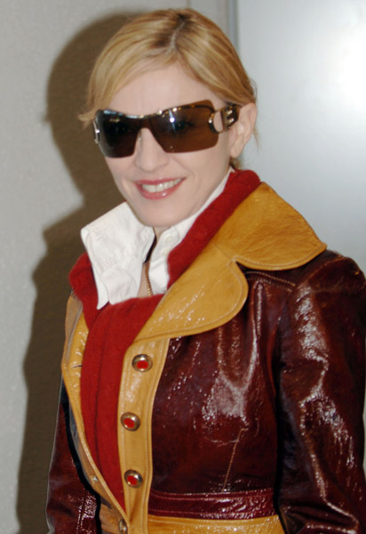 Para su llegada, Madonna lució un tapado en cuero de tres colores de «Dolce & Gabbana», gafas de sol modelo «Airspread 1» de «Dior» y collar de «Choper».