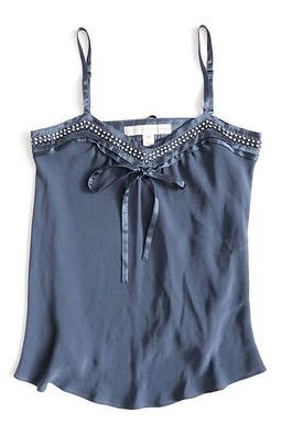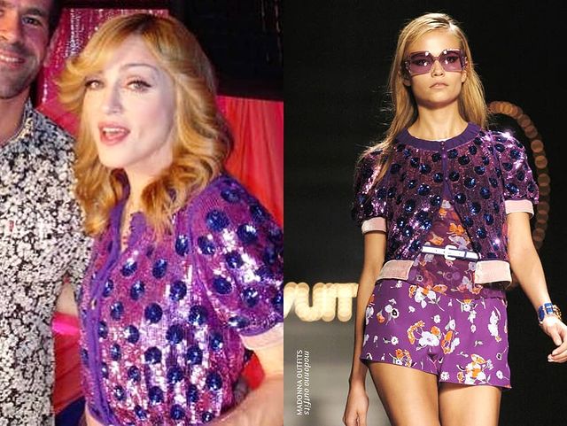 Para estas entrevistas, Madonna usó un cardigan de lentejuelas con lunares en tonos violetas y lilas de la colección primavera-verano 2005 de la firma «Louis Vuitton».