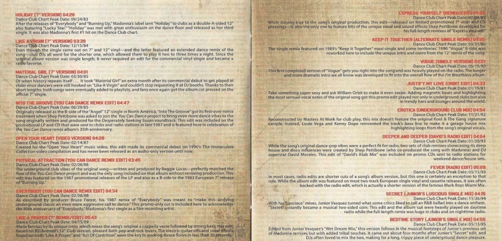Para la edición full se escogió una fotografía de Gary Heery tomada para la sesión del disco «Madonna» (1983), la misma fue retocada digitalmente. El fondo es de color arena con todos los títulos de los singles. Incluye un booklet más completo con la fecha del posicionamiento de cada canción en el Billboard Dance y una breve reseña de la misma.