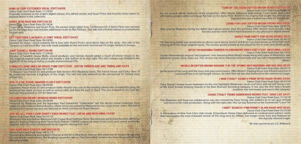- En su versión completa, el álbum contiene 50 remixes especiales y nuevos de todos los éxitos de Madonna en el chart dance durante más de cuatro décadas de carrera. Todos revisitados y remasterizados por Mike Dean, quien trabajó junto a Madonna en sus discos «Rebel Heart» (2015) y «Madame X» (2019). La colección de remixes fue escogida y curada especialmente por Madonna.