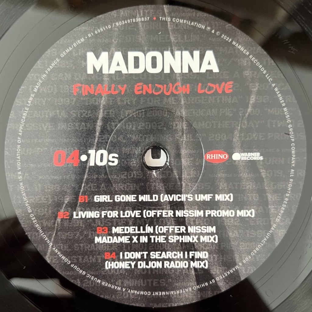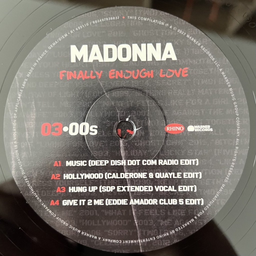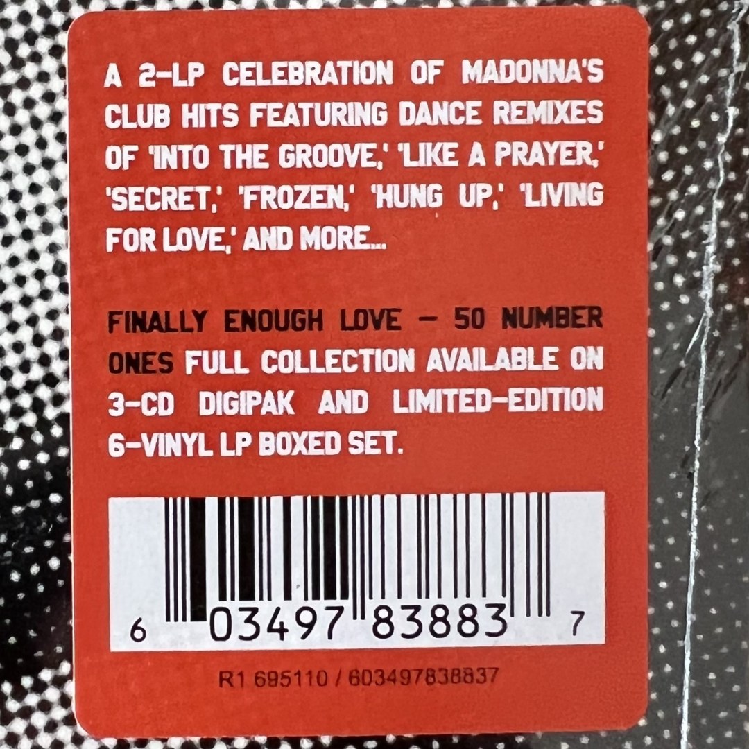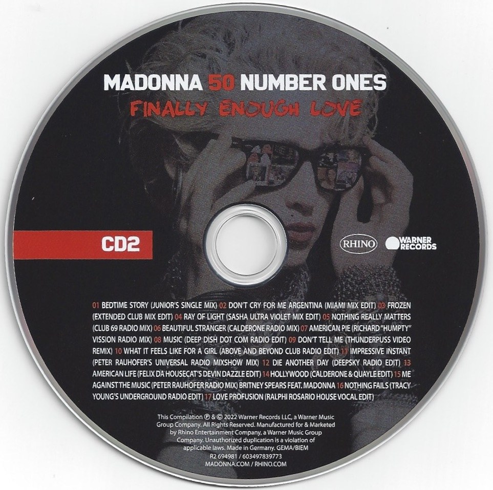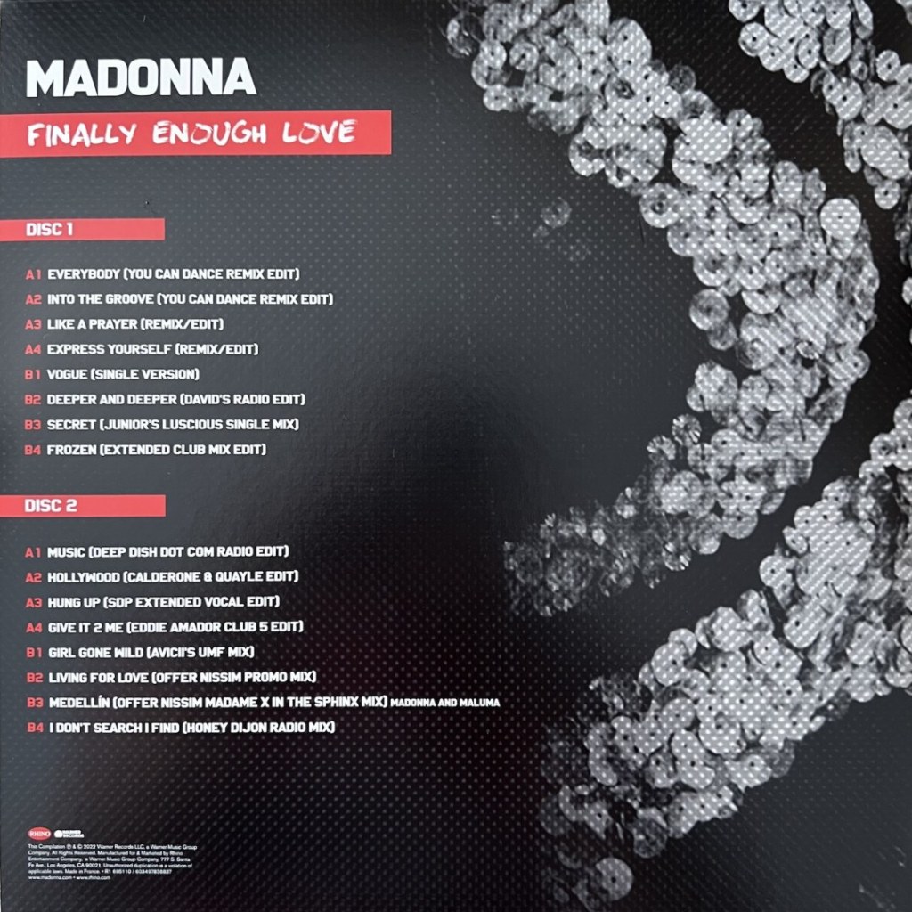 - La primera versión de «Finally Enough Love: 50 Number Ones» que coniene una selección exclusiva de 16 tracks, estuvo disponible digitalmente desde el 24 de Junio de 2022 y dispobible para descargar desde el 19 de Agosto, además del formato físico de 1 CD (U$S14.98) y un set de 2 LP de 180grs (U$S34.98) que se editará en versión regular de vinilo negro y luego ediciones limitadas en color rojo, plata y transparente. Todos con arte y diseño original con la imagen del rostro de Madonna en blanco y negro. Ya puedes pre-ordenarlos aquí.