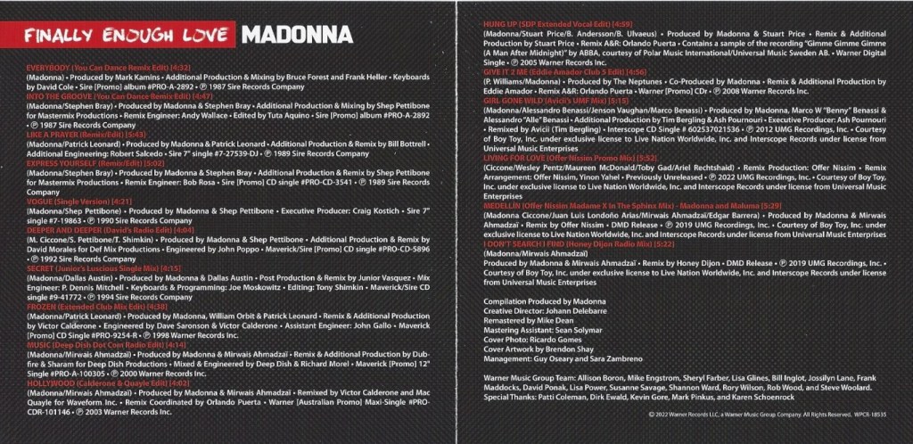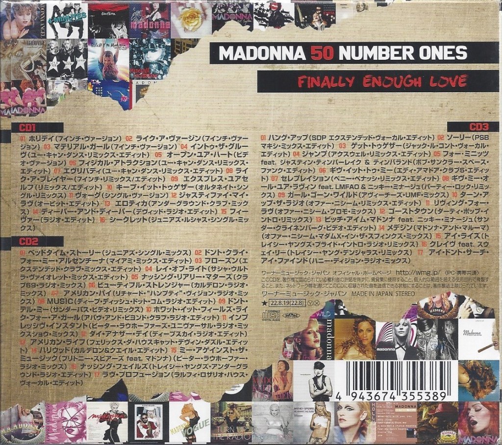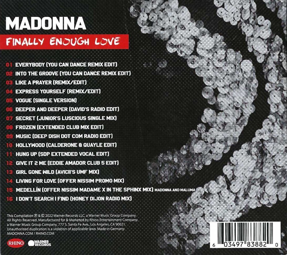 - «Finally Enough Love: 50 Numbers Ones» es el último disco recopilatorio de remixes de la carrera de Madonna lanzado de manera física el 19 de Agosto de 2022; que ya había tenido un lanzamiento previo en formato digital de la edición standard (16 tracks) el 24 de Junio de 2022.