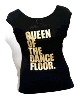 - Camiseta de algodón negra modelo «Queen of the Dance Floor» de su línea de merchandising personalizada con cristales.