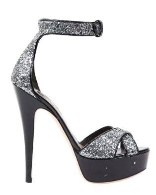 - Sandalias con plataformas y tobillera en glitter plata de «Miu-Miu».