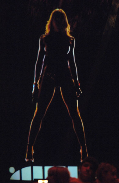 - Para el show, Madonna lució un leotardo manga larga en color lila con incrustaciones de cristales y un coset tipo faja de seda del mismo color con detalles de cordones en los laterales, todo realizado a medida y especialmente por «Dolce & Gabbana».