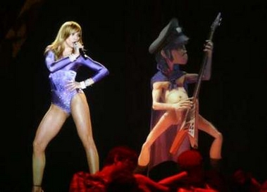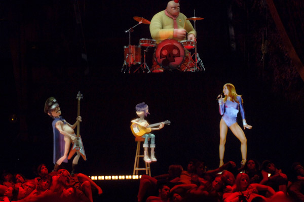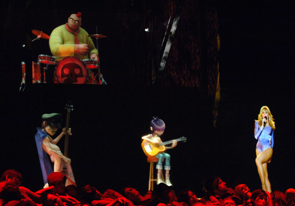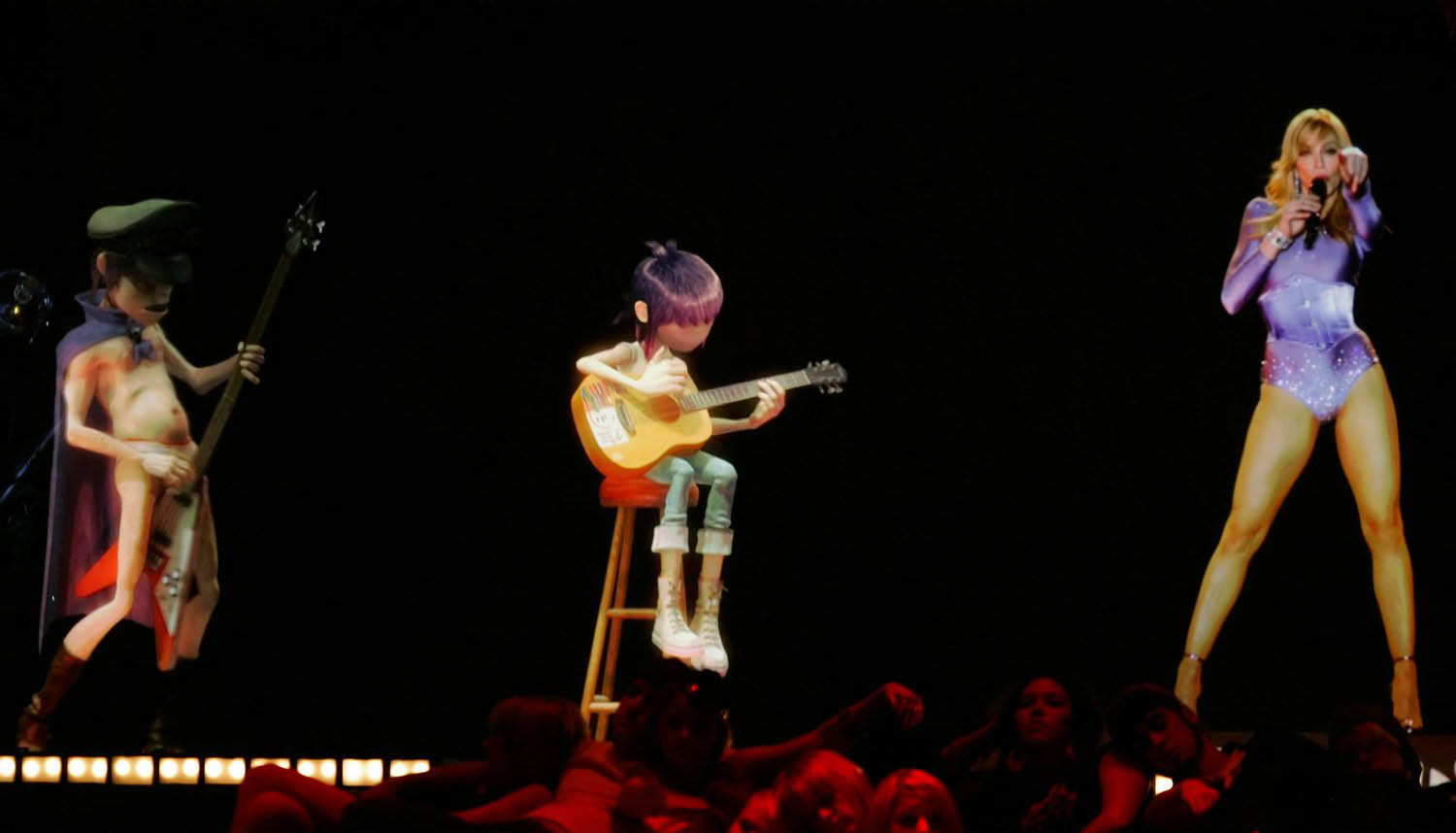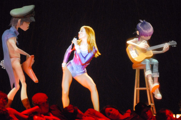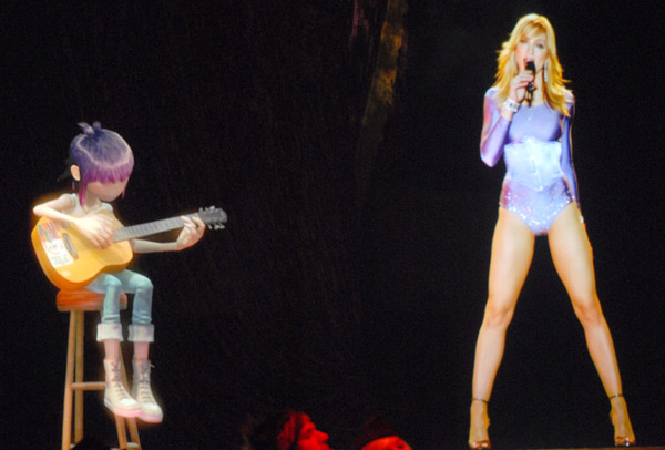 El show comienza con la aparición de la banda Gorila-Z sobre el escenario (el que era una pantalla completamente negra que daba la sensación de que los personajes estaban sobre el mismo) interpretando su hit más conocido «Feel Good Inc». El video de lo personajes interpretando la canción se realizó especialmente para el evento y además de tocar y cantar la canción parecían, de hecho, interactuar con el público en vivo gracias a la tecnología «Musion Eyeliner», un sistema de tecnología y video de alta definición que permite que imagenes móviles aparezcan en la pantalla como si estuvieran en vivo. Al promediar la canción, aparece, sobre una pasarella ubicada al frente el trio de rap «De La Soul» realizando una breve participación. Esta interacción de la animación de fondo y los artistas reales al frente sirvió de fusión perfecta para crear el efecto de que todo era una gran interacción. Aproximadamente a los 2:30 minutos, Madonna aparece desde una plataforma sobre el escenario con el look que ya nos tenía acostumbrados: su peinado con ondas y un leotardo lila con cristales. En ese momento, comienza la introducción de «Hung Up» y Madonna empieza a cantar su hit mientras pasea por el escenario jugando y coqueteando con los personajes animados. Una verdadera innovación y una actuación impresionante. En un determinado momento, Madonna sale de escena y entonces aparece en vivo toda su banda sobre el escenario para continuar con la canción.
