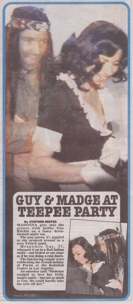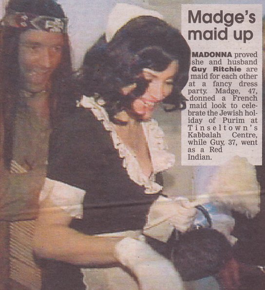 Si recordamos, en 2005, Madonna celebró «Purim» disfrazada de monja en el «Centro de Kabbalah» de Londres, lo que causó algo de revuelo ya que la fiesta judía coincidía con el Viernes Santo del catolicismo. Esta vez, la cantante no quiso ofender a nadie y optó por un disfraz un poco más mundano pero no así menos divertido. Madonna y su marido Guy Ritchie asistieron a la fiesta que se llevó a cabo el lunes 13 de Marzo en el «Centro de Kabbalah» de Los Angeles disfrazada como una típica mucama francesa: vestido corto negro, delantal blanco, cofia y una peluca de color oscuro. Su marido, por el contrario optó por un disfraz de indio piel roja americano con la piel coloreada, peluca negra y hasta pluma en la cabeza. La pareja se mostró muy divertida en el evento e incluso algunos aseguran que Ritchie hasta se animó a hacer «la danza de la lluvia».