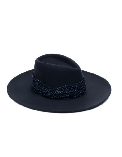 - Sombrero negro de felpa con cristales en color negro modelo «Harlowe» de la diseñadora Eugenia Kim.