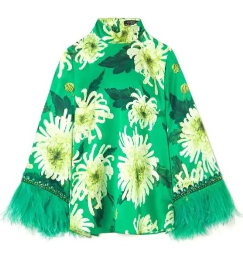 - Blusa de seda verde con estampado de flores amarillas, mangas con pedrería, lentejuelas y plumas perteneciente a la colección otoño-invierno 2022 del diseñador Andrew Gn.