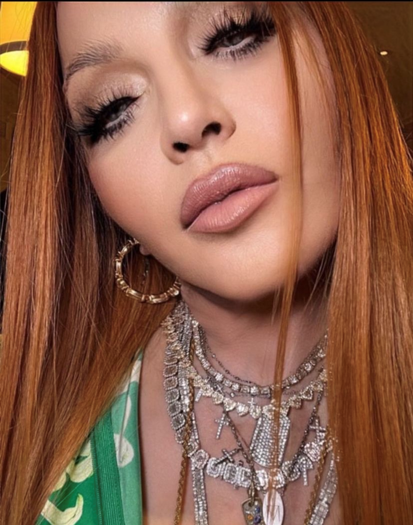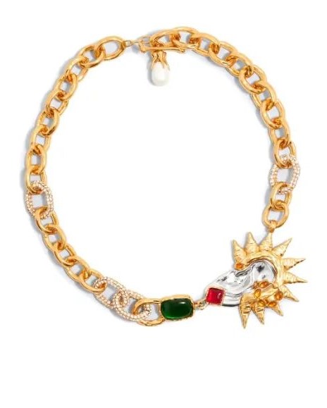 - Collar y colgante de oro con diamantes, esmeralda y rubí y dije en forma de sol (Madonna lo usó como cinturón) de «Schiaparelli».