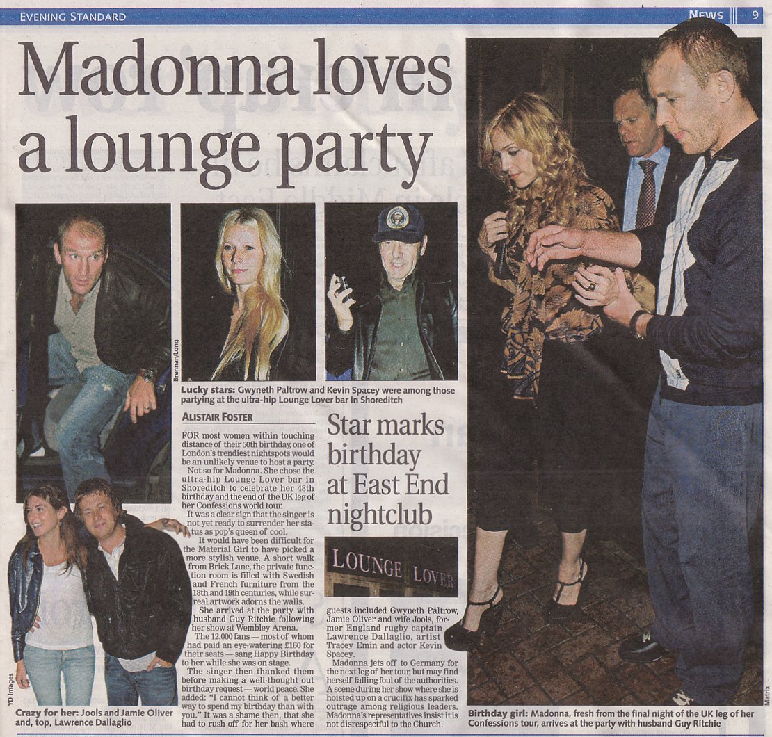 Luego de su último show en Londres en el Wembley Arena de «The Confessions Tour», Madonna ha demostrado que tiene energía para derrochar. A pesar de haber terminado pasada la medianoche de su show y mientras todo el equipo se preparaba para continuar viaje hacia Alemania, donde se presentaría en Dusseldorf cuatro días despúes, la Reina del Pop no ha dudado en continuar la fiesta. Para celebrar su cumpleaños N°48, Madonna rentó el exclusivo bar «Lounge Lover» por más de U$S 100.000 para agasajarse y agasajar a sus más de 100 invitados.