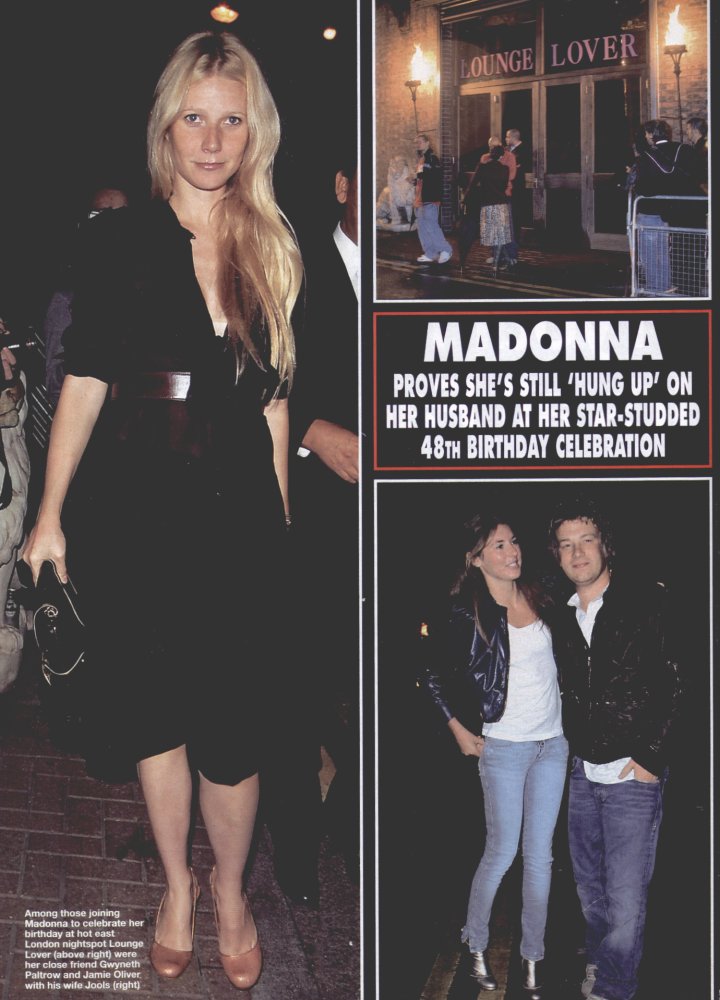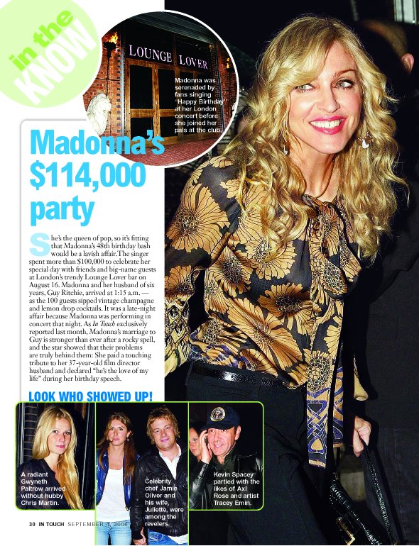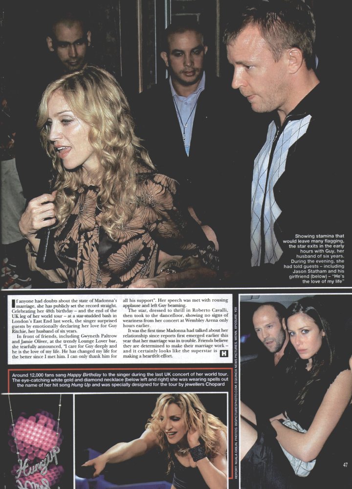 Pasadas la 1:15 de la madrugada, Madonna apareció en el lugar del brazo de su marido Guy Ritchie (desmiendo rumores de problemas maritales) y engalanada con un impecable conjunto de falta y blusa estampada de seda de Roberto Cavalli. La cantante festejó hasta altas horas de la madrugada con todo el staff de su gira y gran cantidad de celebridades amigas como Gwineth Paltrow, Kevin Spacey, Jamie Oliver o Lawrence Dallagio. Luego de la fiesta, Madonna volvió a su casa de Londres para descansar y seguir viaje con su exitosa gira.