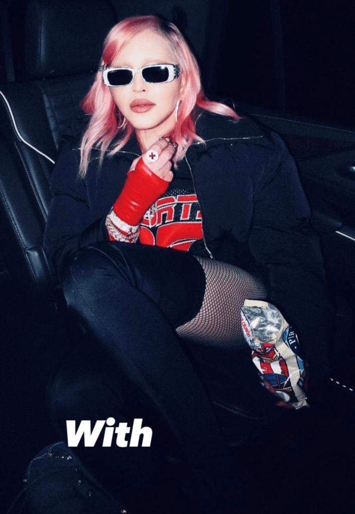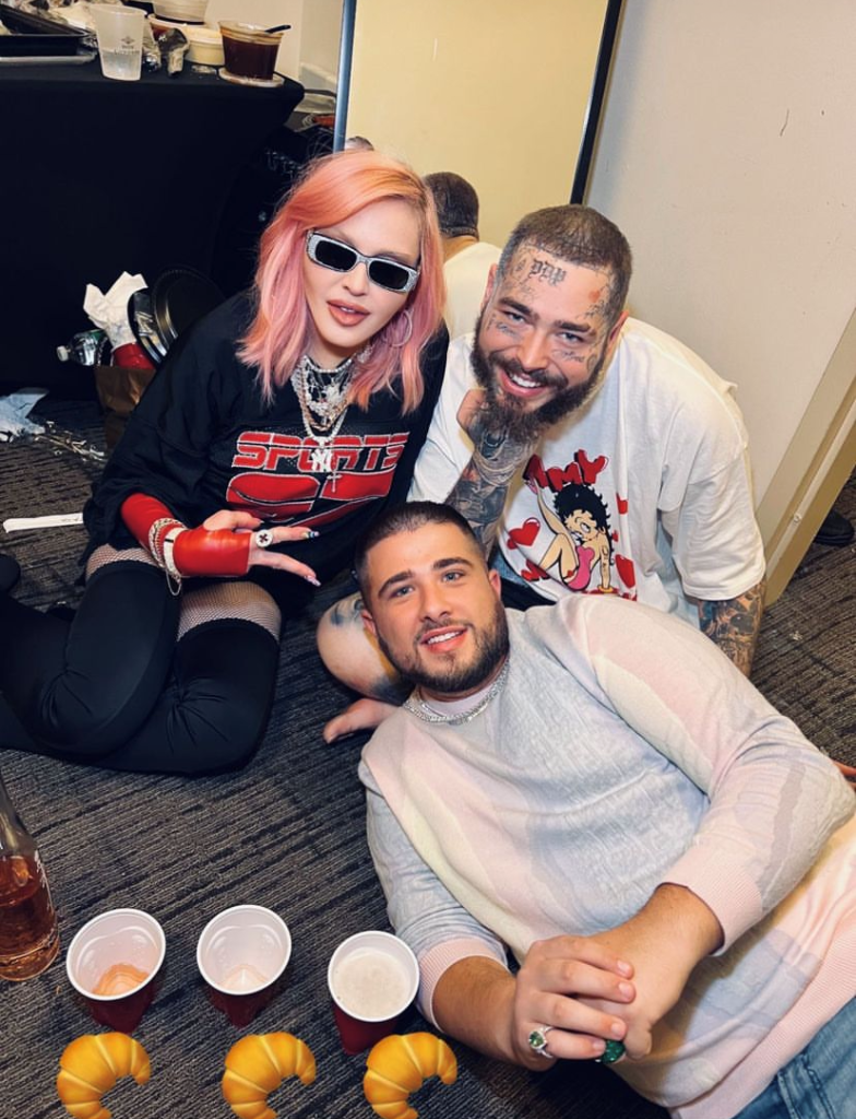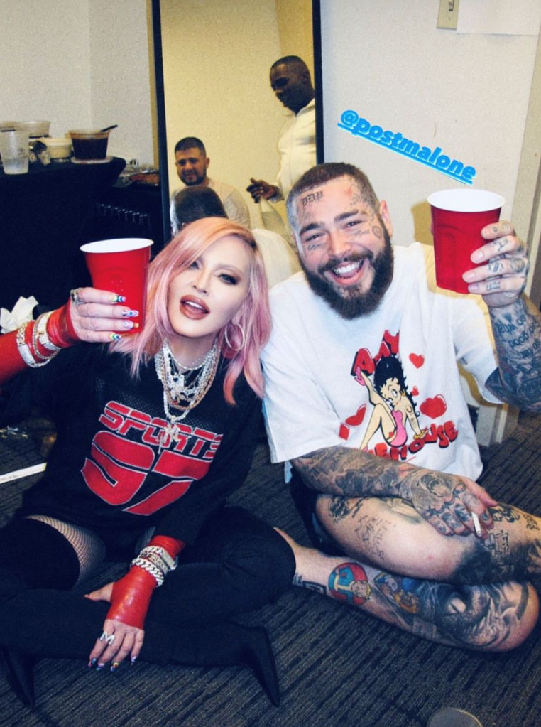 Madonna fue a presenciar el show del cantante Post Malone, se la veía bastante entusiasmada y de buen humor. La Reina del Pop disfrutó del espectáculo y más tarde se unió al artista en camerinos para disfrutar de un buen vino y unas típicas croissants francesas. Madonna subió algunas fotos a sus stories de Instagram, con algunos textos como: «Me haces sentir como una estrella de rock», «también arriba y abajo» o «lleva mi alma con tu croissant».