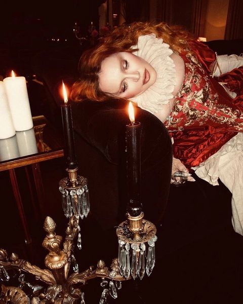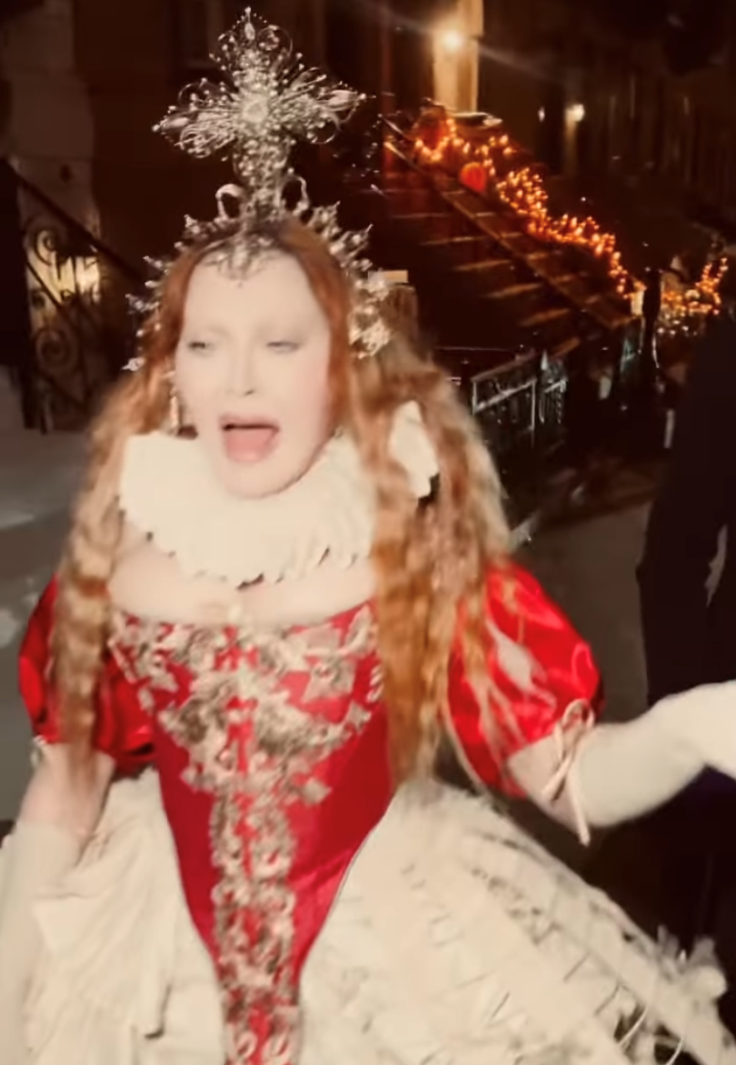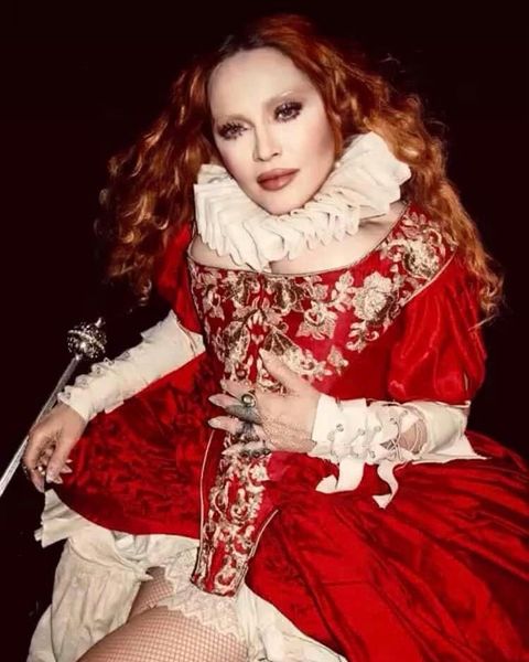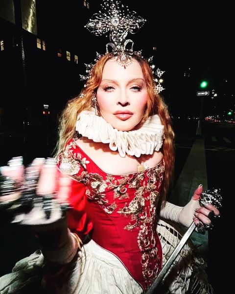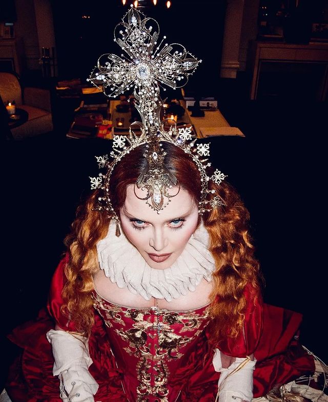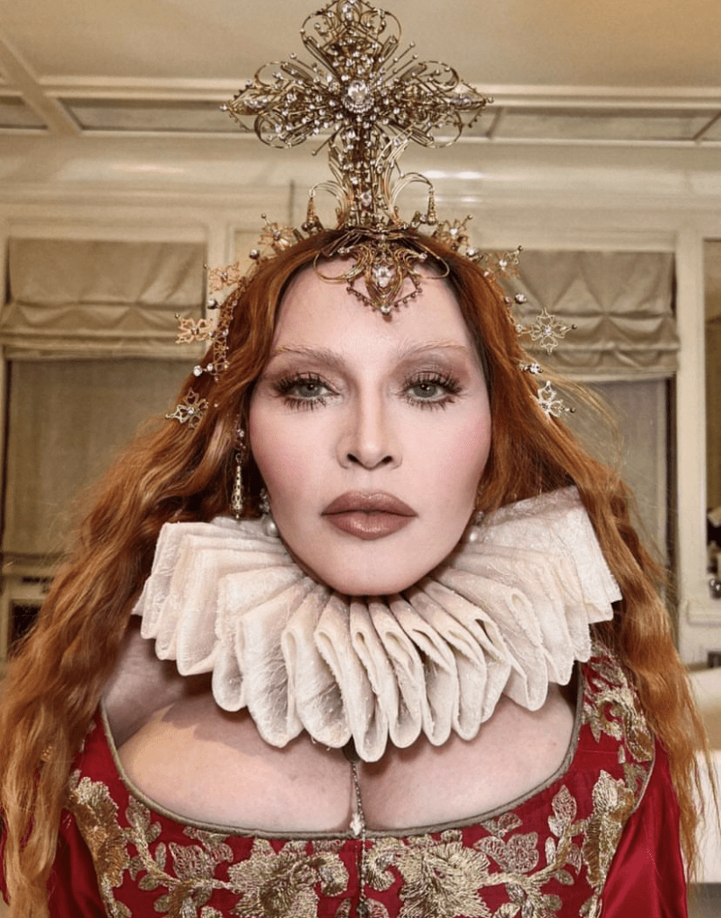Para esta ocasión, la Reina del Pop, decidió rendir homenaje a otra Reina, en este caso a Elizabeth I, también conocida como la «Reina Virgen» quien gobernó Inglaterra e Irlanda desde 1558 hasta el día de su muerte en 1603. Madonna lució un vestido con corset, top con mangas largas y abullonadas en los hombros y falda amplia todo en seda de color bordó intenso con detalles de bordados en dorados, inspirados en los atuendos originales de la monarca. Como dato de curiosidad, el corset realizado especialmente para Madonna fue confeccionado por la firma «Period Corsets», la misma que realizó el corset lila que la cantante lució en su video «Sorry» (2006). En algunas imágenes pudimos ver que Madonna usó dos pares de botas de cuero, uno blanco y otro negro, ambos de la firma «Miu Miu», el primero de la colección 2008 y el segundo de 2018. Para completar el estilo, Madonna usó joyas vintage sobre todo anillos y aretes de diamantes y perlas. Completó el atuendo un cuello de bucles fruncido y un tocado para la cabeza en forma de corona con una imponente cruz trabajada en estilo filigrana con incrustaciones de diamantes, zirconios y perlas.