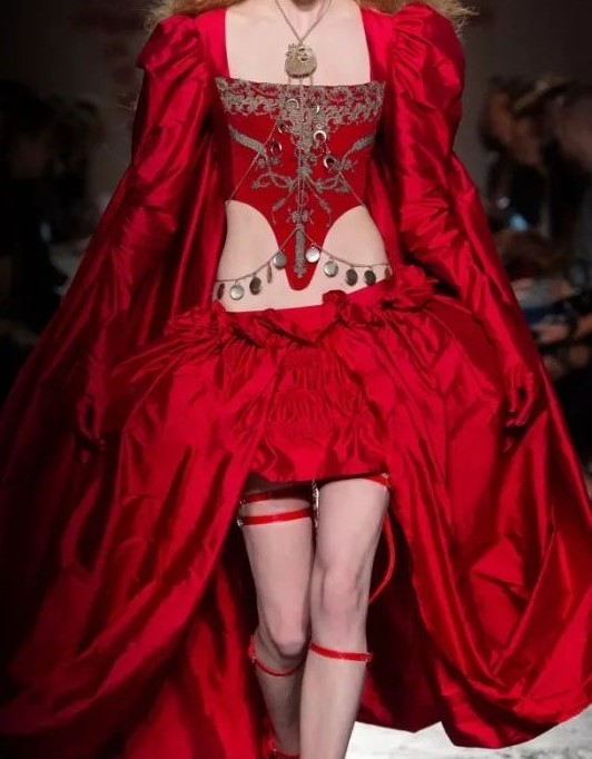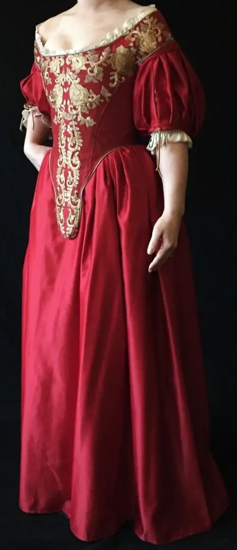 - Corset de seda en color rojo con apliques y bordados en dorado e hilos de oro realizados especialmente para la ocasión por «Period Corsets».