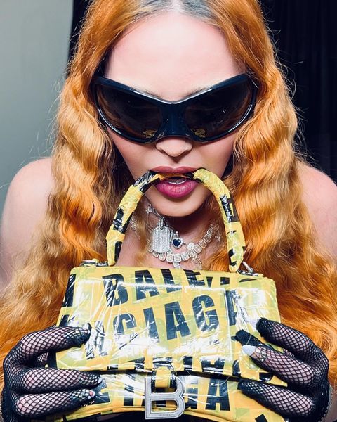 Nuevas fotos nos compartió la Reina del Pop en su mansión de Hidden Hills en Los Angeles, por supuesto a cargo de su amigo, Ricargo Gomes. En las mismas, vemos a Madonna posando en su baño con zapatos de tacón, medias negras, un corset del mismo color y topless, el cabello suelto y gafas de sol envolventes. Como siempre, Madonna sabe como provocar y luego de una pequeña polémica en algunos medios por una foto que había subido anteriormente en donde mostraba sin verguenza sus pechos, esta vez, la cantante ha decidido ser un poco más sugerente y no tan explícita. En las fotos, vemos que Madonna tapa sus pechos con una nueva adquisición que parece encantarle; se trata de la nueva bolsa de «Balenciaga» envuelta en cinta. El bolso, modelo «Hourglass Small Handbag in Box With Tape in Yellow” consiste en un pequeño bolso rígido de forma semi rectangular con manijas curvilíneas y una «B» de metal en el frente, la característica especial es que el accesorio se encuentra completamente forrado con cinta adhesiva en color amarillo con grandes inscripciones en negro de la marca. Esta pieza fue estrenada por Kim Kardashian en la pasada «Paris Fashion Week» y es tan especial ya que se confeccionó a mano en Italia y en edición estrictamente limitada al módico precio de U$S 3100. Madonnna ya tiene la suya por supuesto.