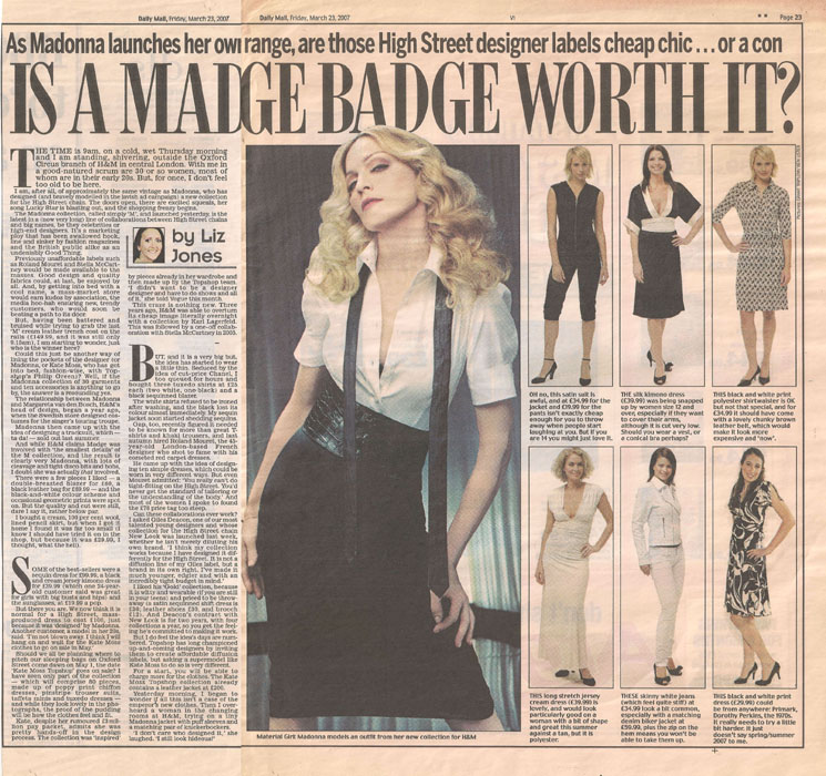 Margareta Van den Bosch comentó: «Madonna tiene un sentido impresionante de la moda y las tendencias. Ella fue extraordinariamente consciente del estilo, apasionada e involucrada incluso en los detalles más pequeños; es una profesional total, inspiradora y entusiasta. El resultado es ‘M by Madonna’, que tiene que ver con la moda que la gente realmente puede amar y usar temporada tras temporada”. Fundada en Suecia en 1947, «H&M», que hoy cuenta con más de 1.300 tiendas en Europa, Norteamérica, Oriente Medio y Este de Asia, es sinónimo en todo el mundo de moda y calidad al mejor precio. «M by Madonna» se lanzó el 22 de Marzo de 2007 simultáneamente en todas las tiendas del mundo en donde los fans (tanto de Madonna como de la moda) se lanzaron casi compulsivamente a comprar cada una de las prendas de la colección. En Hong Kong, (único páis del mundo en donde la colección estuvo a la venta una semana antes) la gente hizo cola por varias horas, lo mismo sucedió en París e Italia. Además del diseño de la colección, Madonna también estuvo a cargo de la campaña publicitaria que consistía en un extenso porftolio fotográfico a cargo de Steven Klein para prensa, catálogos y cartelería urbana como así también un comercial de televisión.