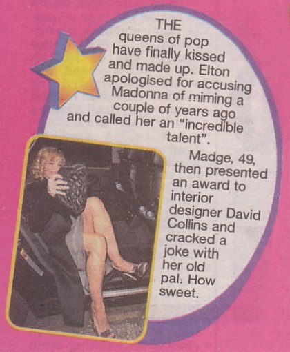 Recordemos que la disputa estalló después de que el cantante con anteojos acusó públicamente a nuestra «chica material» de hacer playback en sus giras. En la ceremonia de los «Q Awards» del 2004, Elton John denostó a la gira «The Re-Invention Tour» de Madonna declarando: «Madonna, mejor acto en vivo? Vete a la mierda. ¿Desde cuándo el playback se considera en vivo? Quedaré fuera de su maldita lista de tarjetas de Navidad, pero ¿me importa? No…» Sin embargo, las superestrellas pusieron fin a la pelea con un abrazo en el escenario y con Elton John declarando que su pelea había terminado: «Este es un momento que pensaste que nunca verías». Pero John no pudo resistir una última burla, revelando que después de su disputa había «escrito una disculpa servil y se ofreció a unirse a la Kabbalah».