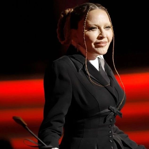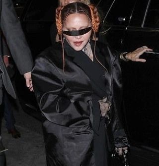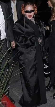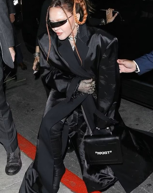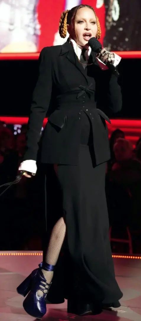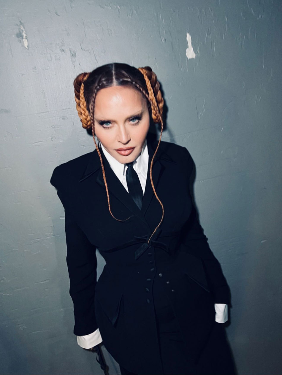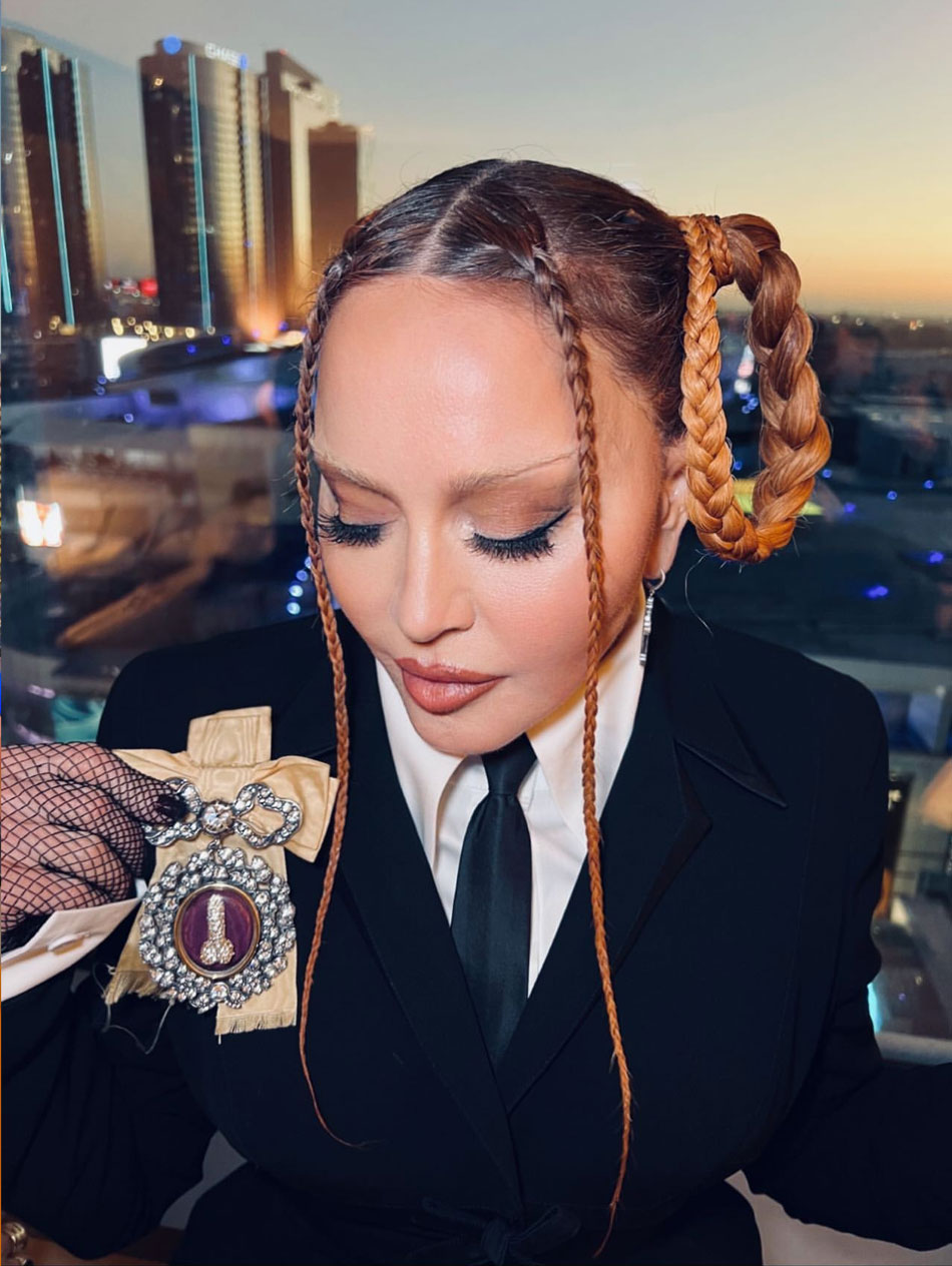 La diva llegó al evento luciendo un ajustado conjunto de falta extralarga y saco cruzado en color negro, camisa blanca y corbata negra también, complementaron el atuendo guantes de red, botas con plataforma y una fusta (parece que últimamente el espíritu de Dita Parlo ha vuelto a rondar). Para disgusto de muchos fans, la diva ha vuelto a las trenzas y al parecer son sus predilectas; el peinado consistía en dos largas trenzas atadas en los laterales y dos más finas el frente. Ya en sus redes sociales, Madonna había posteado una foto en donde se apreciaba su look con la leyenda «and the winner is…» («y el ganado es…») dando una pista de lo que se vendría.