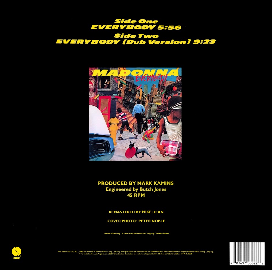 El disco viene en un sobre de papel que contiene las mismas imágenes utilizadas para la tapa de 1982 (collage obra de Lou Beach); las etiquetas de los discos son en color azul y amarillo con un gran logo de SIRE. El contenido es el mismo que el disco original con las dos versiones oficiales de «Everybody» (la 12″ y dub version) pero remasterizadas. Este single también se editó en formato digital disponible en todas las plataformas de música.