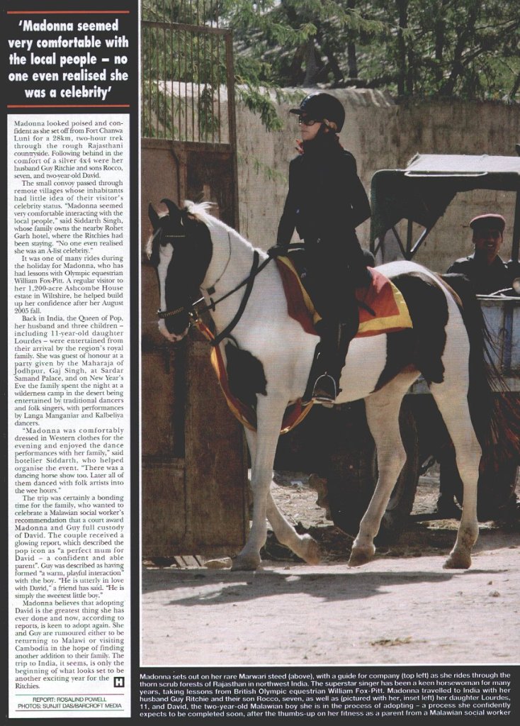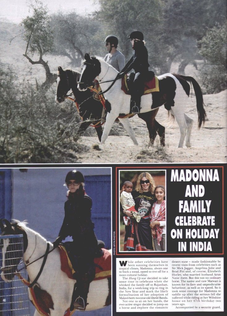 Para comenzar el nuevo año, la popular cantante ha elegido como lugar de descanso la región de Rajasthán, situada al noroeste de la India. Allí ha recorrido la zona junto a su marido, el director británico Guy Richie, y sus hijos Lourdes, Rocco y David. Madonna llegó a la India el 31 de diciembre para recibir el nuevo año y se alojó en el lujoso hotel «Ummed Bhawan», lugar en el que se habían alojado con anterioridad Angelina Jolie y Brad Pitt, que visitaron el país en octubre del pasado año con motivo del rodaje del film «A Mighty Heart», en el que Angelina había participado. La estrella, que aterrizó el día previo en la ciudad de Udaipur, ha visitando los conocidos palacios, fuertes y desiertos de la región de Rajasthán, la zona turística india por excelencia; se mostró muy interesada por el estilo, la arquitectura y las pinturas de los lugares que visitaba y, según afirma uno de los guías, les desbordaba con múltiples preguntas afirmando que la zona la ha dejado «fascinada», y que estaba asombrada en especial por los ritmos, tanto es así, que, la también actriz, podría estar pensando en incorporarlos a su próximo disco el cual se encuentra en proceso de post-producción. Mientras, su marido, ha centrado su interés en la gastronomía local, para la que no ha escatimado elogios y que ha calificado de «adictiva». Madonna y familia pasaron la noche del 31 de Diciembre para recibir el nuevo año en un lujoso campamento en una zona desértica en donde disfrutaron de manjares locales y bailaron al ritmo de artistas de la zona con música tradicional como Langa Manganiar y Kalbeliya.