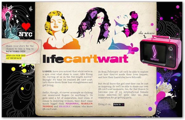 Para la campaña, titulada «Life Can’t Wait» se escogió la icónica imagen de Herb Ritts tomada a Madonna durante la sesión del disco «True Blue» (1986). La foto fue retocada para similuar un dibujo con tonos de colores rosas y lilas y dentro de la silueta del cabello de Madonna se incorporaron otras imágenes de la cantante de diferentes años como podemos ver del 1998 y 2005. Esta edición de Madonna fue utillizada para la línea de productos que realizan el volúmen del cabello.