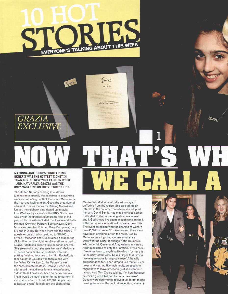 La noche del 06 de Febrero de 2008, gran cantidad de celebridades y estrellas de primera línea se reunieron en las carpas levantadas en los jardines del piso 38 del edificio de las Naciones Unidas en Manhattan para participar de una exclusiva cena de gala benéfica. El evento estuvo organizado por la mismísima Madonna en conjunto con la UNICEF para recaudar fondos para la fundación creada por la cantante «Raising Malawi» que se encarga de dar ayuda humanitaria y económica a Malawi, país africano de donde es oriundo su pequeño hijo David Banda. Madonna concurrió acompañada de su hija, la pequeña Lourdes María quien se mostró muy complacida ante la atención de toda la prensa.