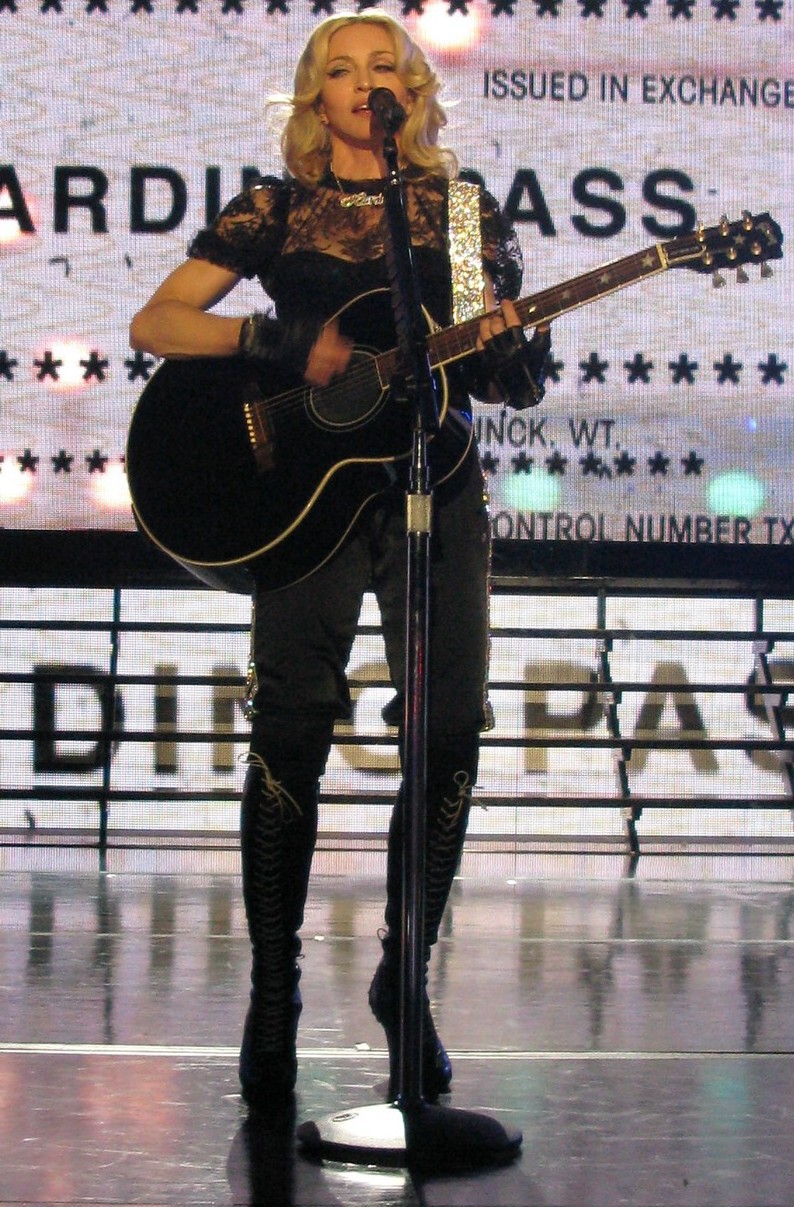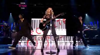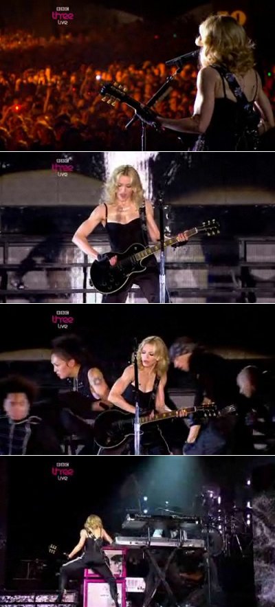Otro momento con guitarra, esta vez eléctrica para realizar una versión hard de «Hung Up» previamente, Madonna interpretó algunos versos de «I Can’t Get No Satisfaction» de los «Rolling Stones».