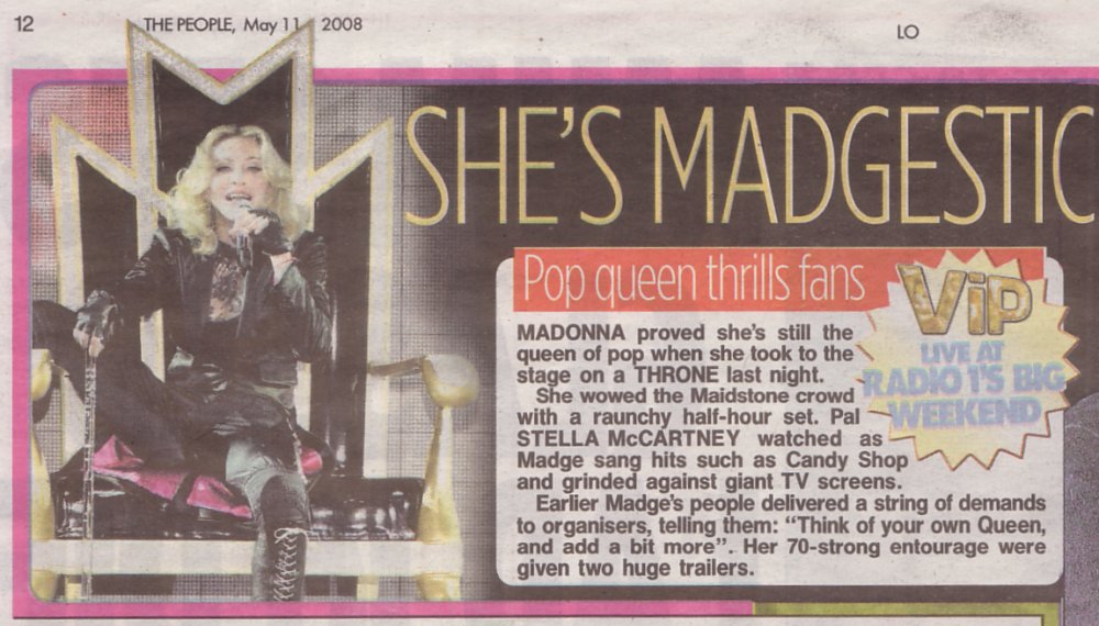 Finalmente, en UK, el «Hard Candy Promo Tour» formó parte del «Radio 1’s Big Weekend» un festival de música organizado por la BBC en «Monte Park» en la ciudad de Maidstone siendo transmitido en vivo por la BBC3. Con respecto al show en UK, surgieron algunas críticas y denuncias a Madonna por el uso de groserías en el escenario, sobre todo la palabra con «F» que tanto pánico causa a la audiencia inglesa.
